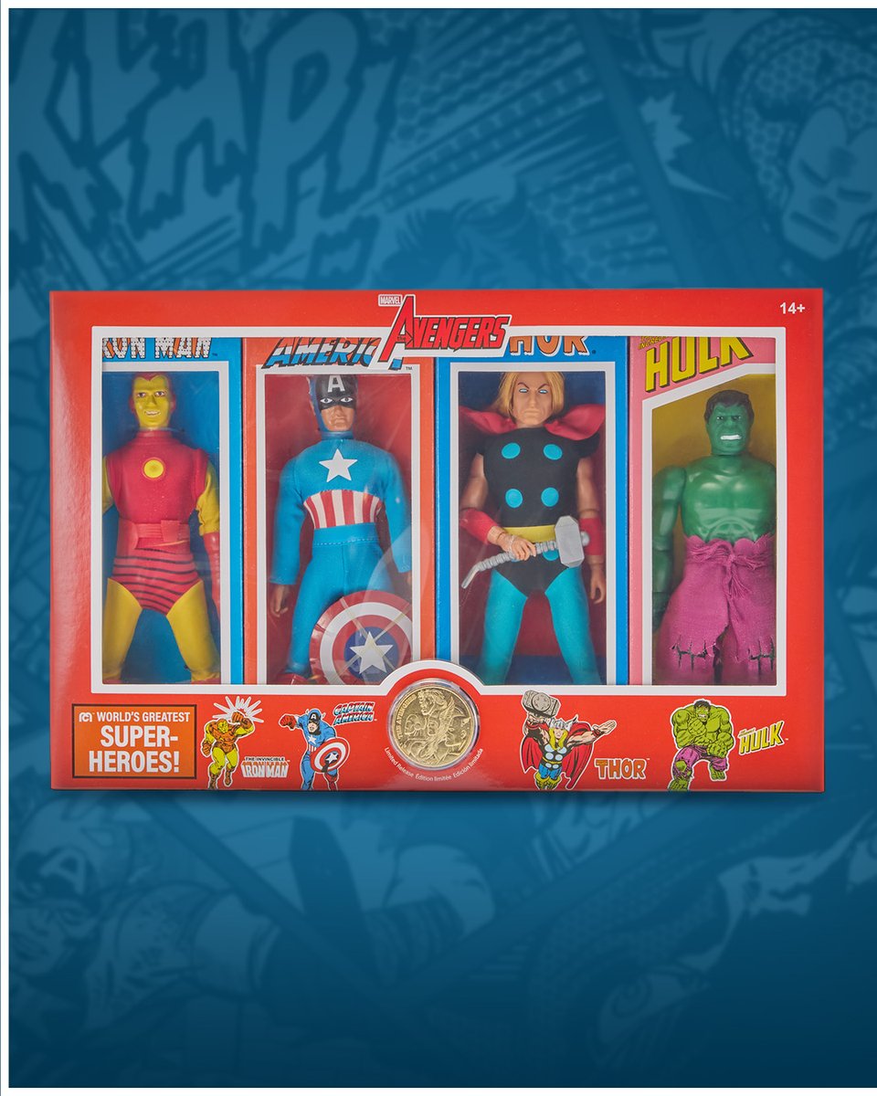 - Includes metallic coin with bas relief Avengers art on one side and classic Mego logo on the other