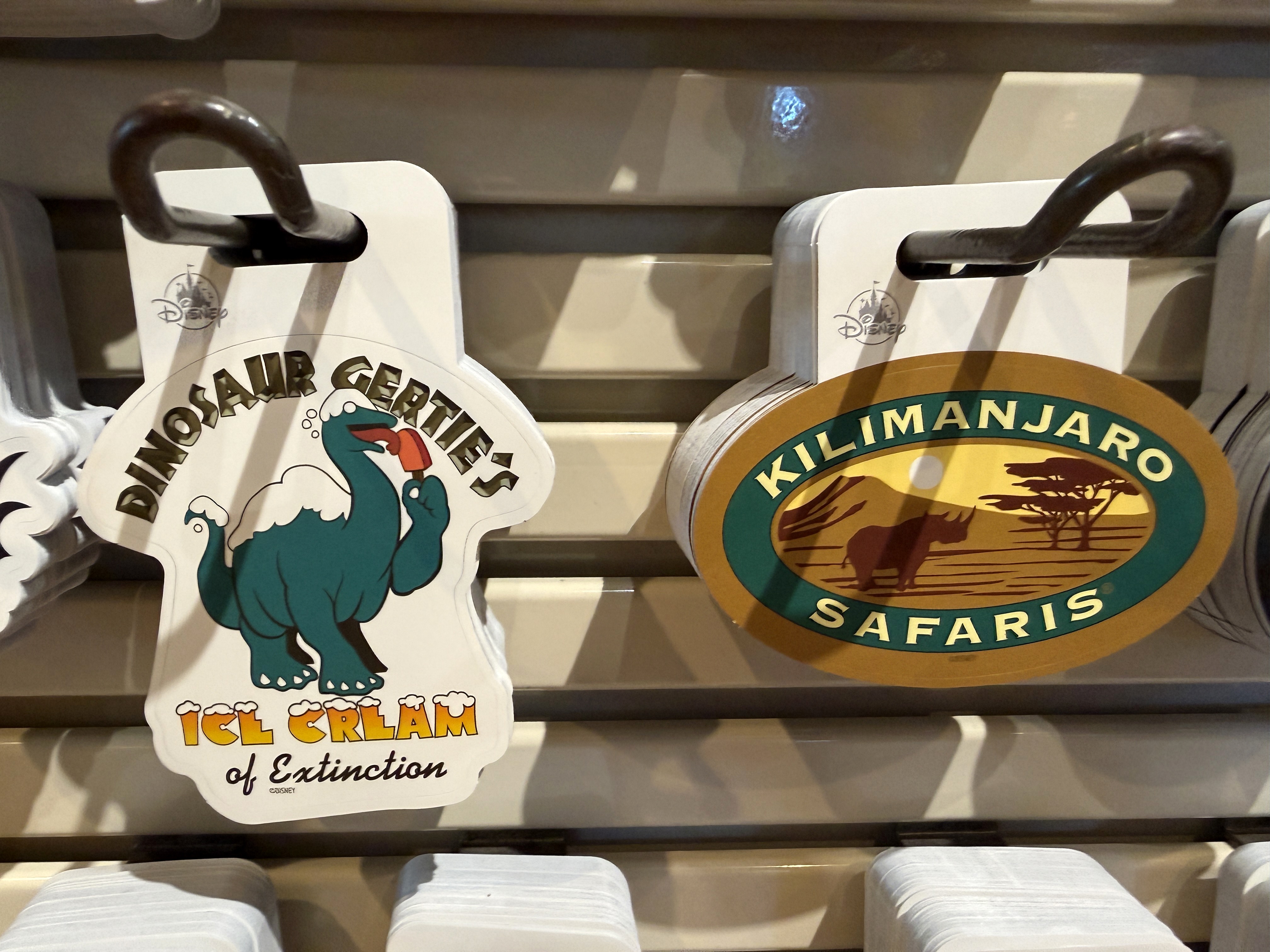 Dinosaur Gertie from Disney's Hollywood Studios continues to get more merchandise representation, alongside the logo for Kilimanjaro Safaris at Disney's Animal Kingdom.