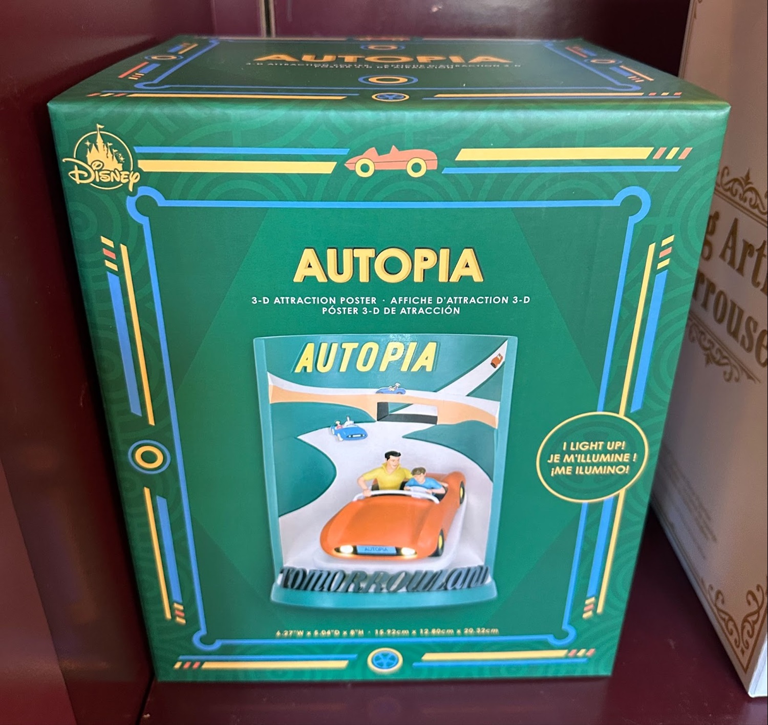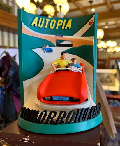 Available at the Disneyana Shop on Main Street, U.S.A., these two 3D attraction poster figurines bring two classic designs into three dimensions. First up is the Autopia attraction poster, recreated with a three-dimensional Autopia car with the Tomorrowland written in front of it.