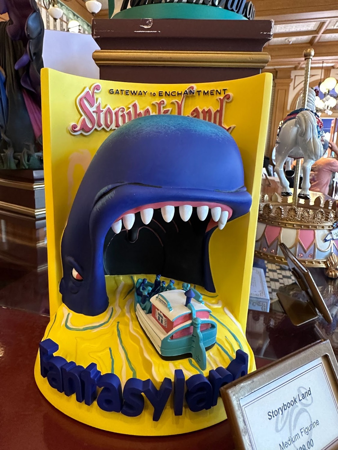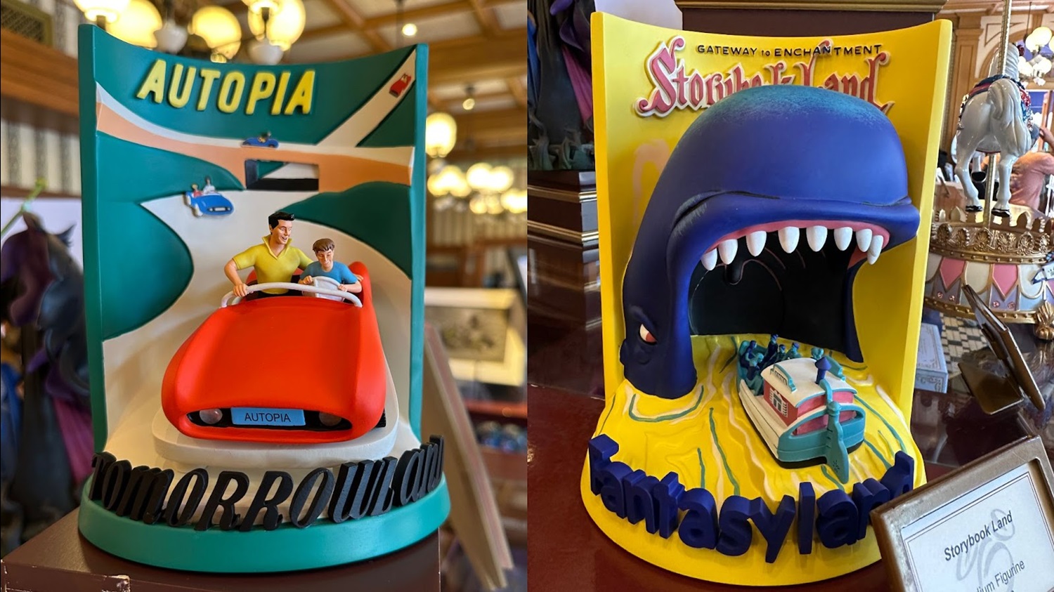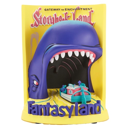 The second figurine features even more three-dimensional elements, with a Storybook Land Canal Boat entering the mouth of Monstro the Whale, with Fantasyland written in front.