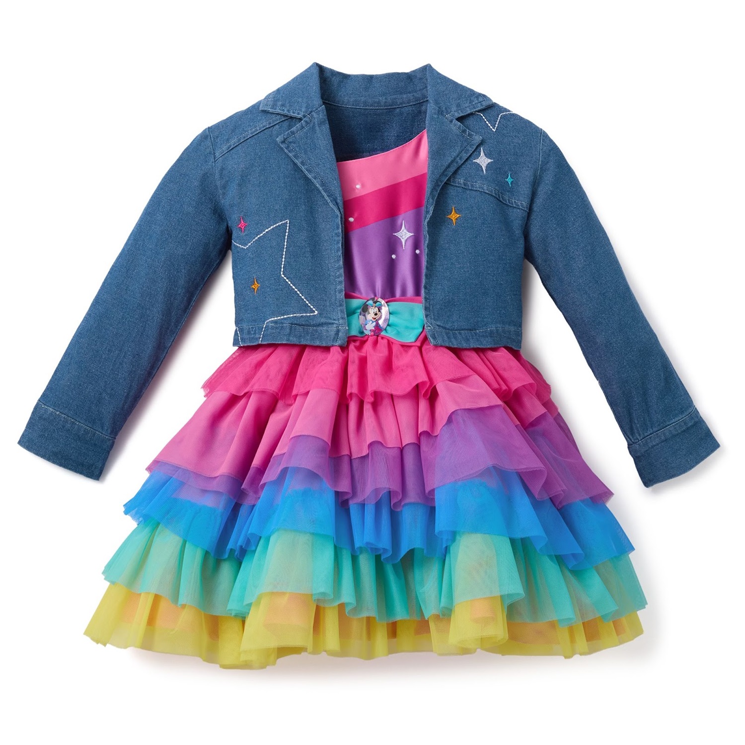 - There’s also a white Mickey Mouse tee featuring the big cheese in his celebration outfit; and kids can join the fun with something a bit fancier: a party dress and jean jacket set that features plenty of ruffled layers of color and matches Minnie’s anniversary look!