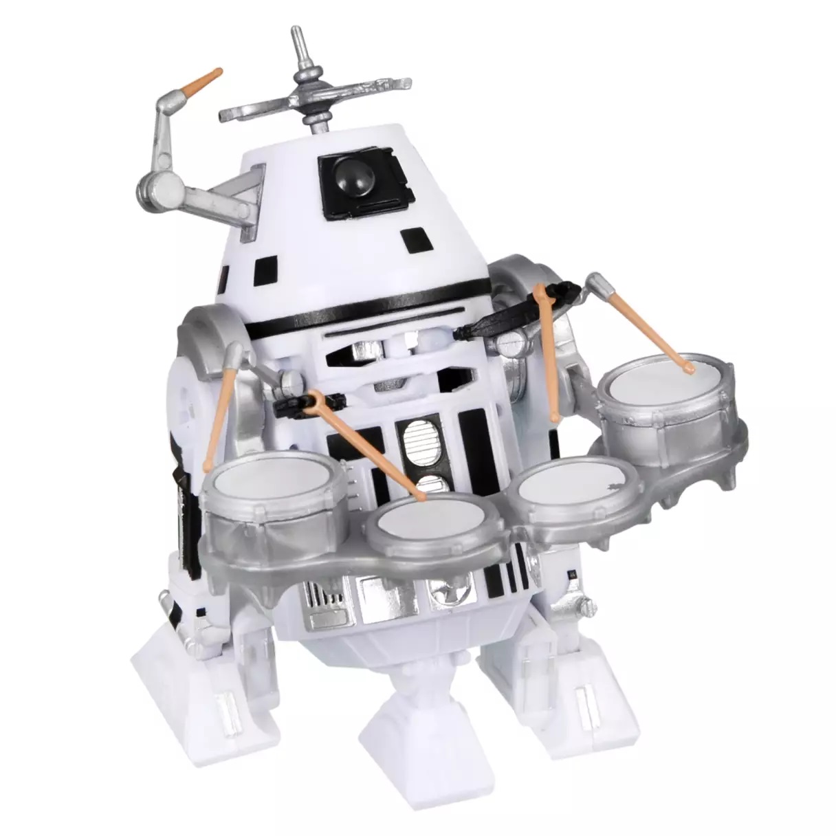 - Each figure has limited articulation for posing and comes with accessories that snap onto the main body. R0-1N6 has a four-piece drum set to entertain guests; while B5-R4 serves drinks, and J7R-T totes around food.