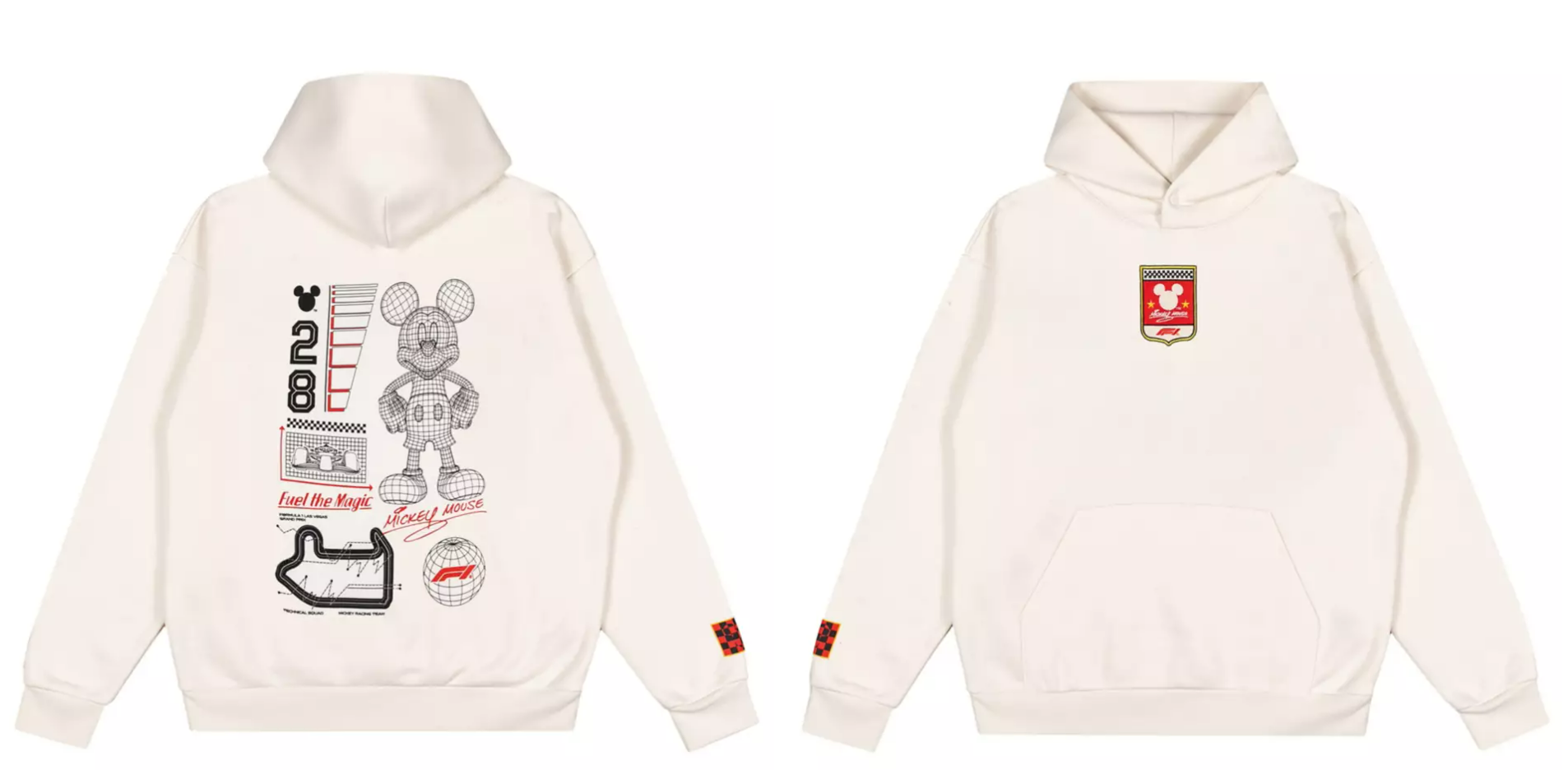 - Disney x Formula 1 Pullover Hoodie for Adults, Cream ($150): This hoodie features a computer-generated rendition of Mickey Mouse on the back, overlaid with a graphic design of the Las Vegas circuit.