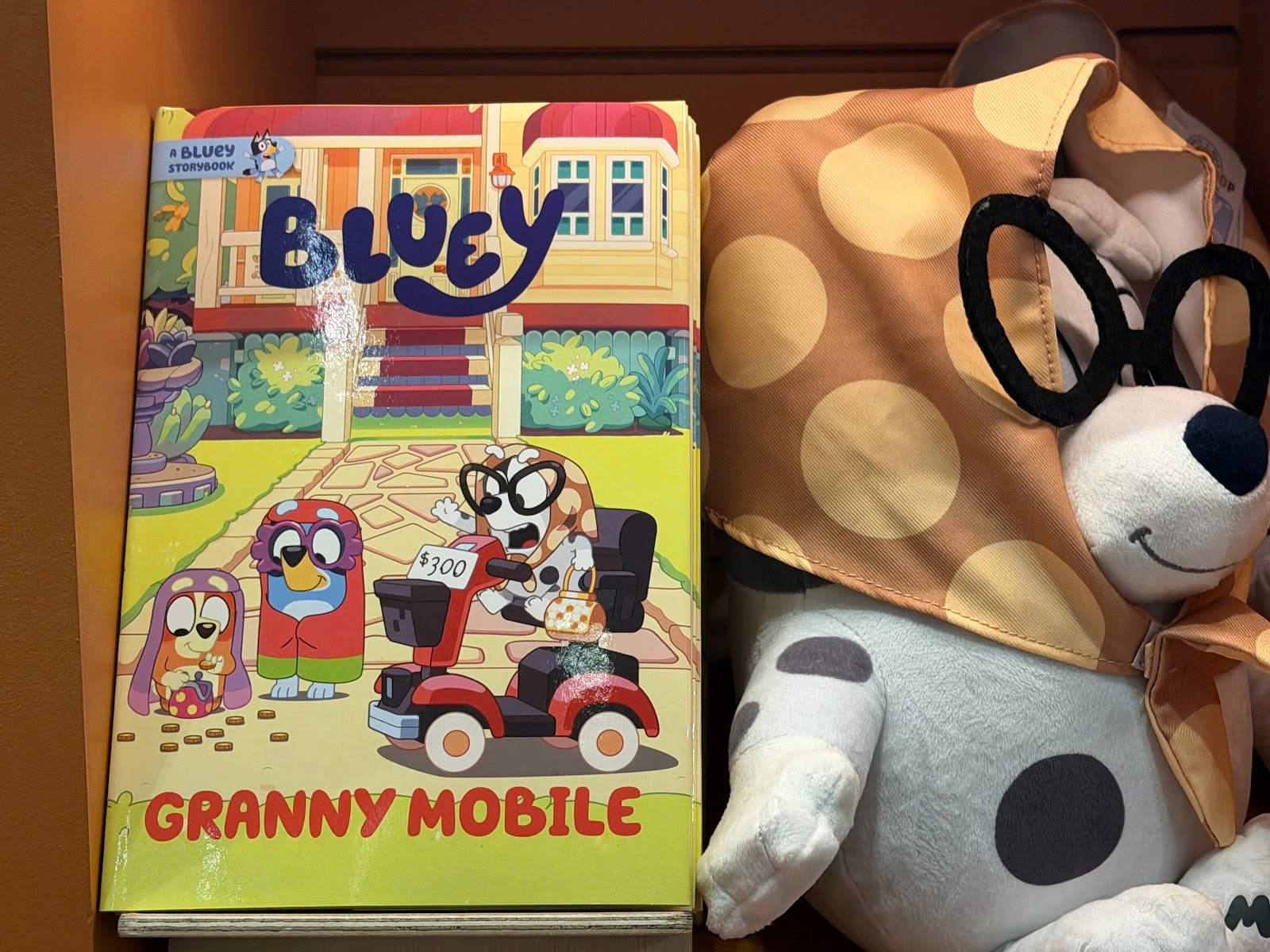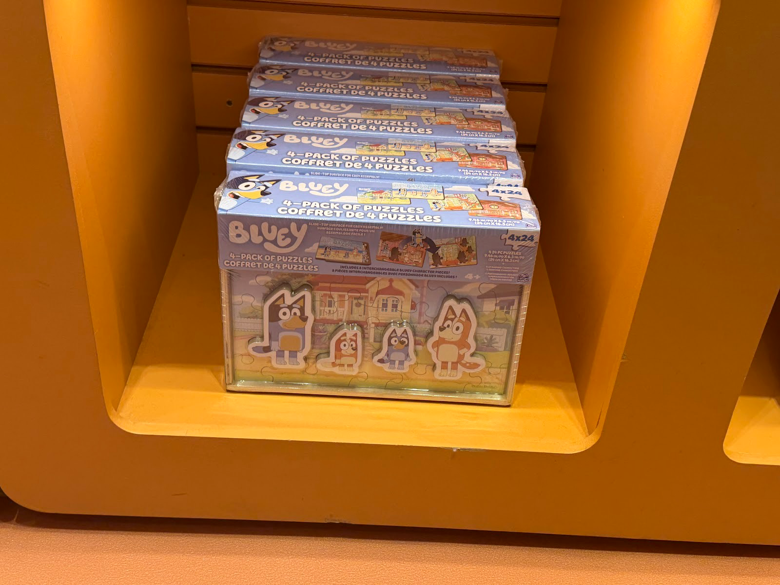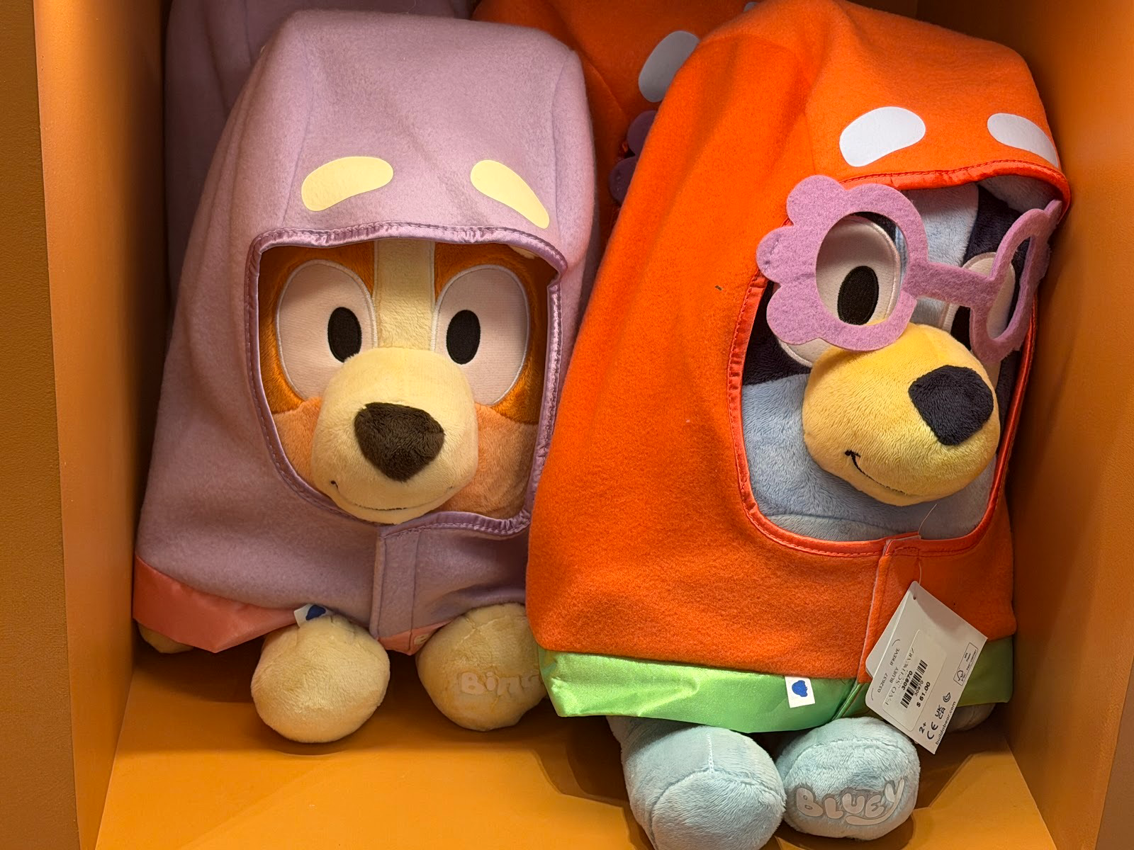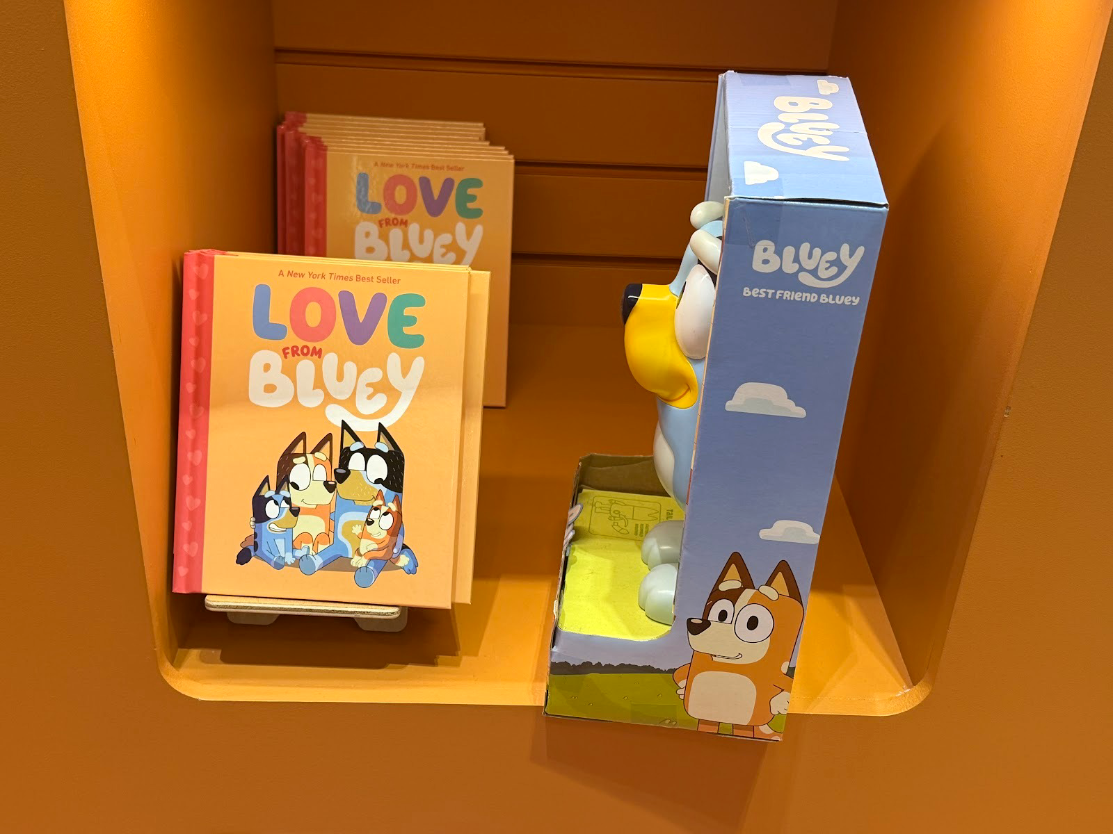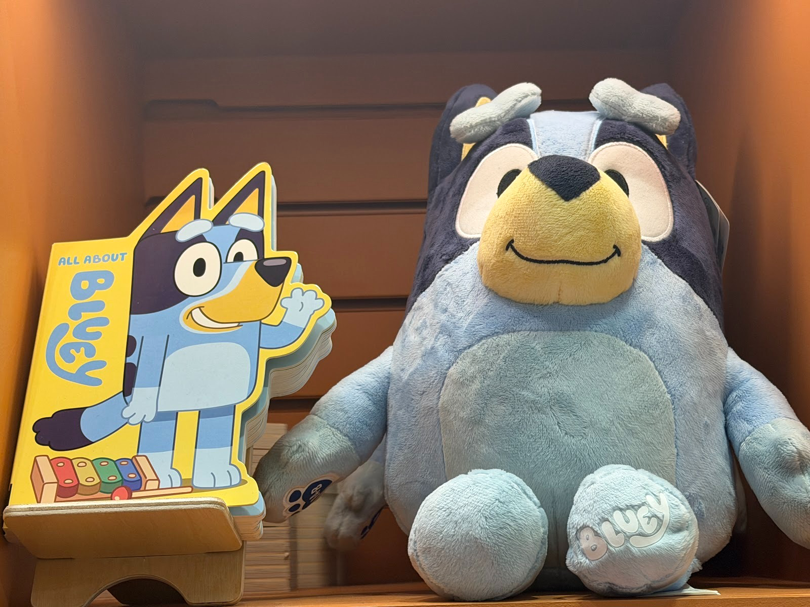 Additionally, there are more Bluey items, including cardboard books and other fun plush and character merchandise scattered throughout a display that looks like their home.