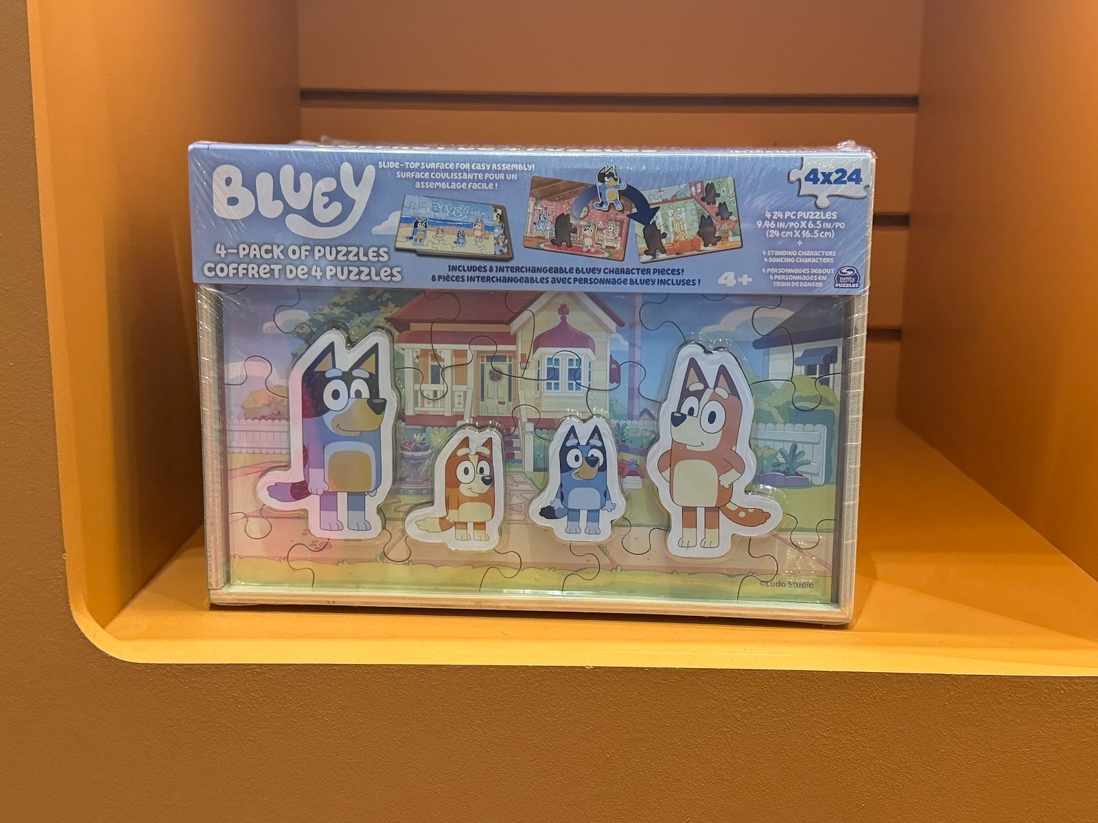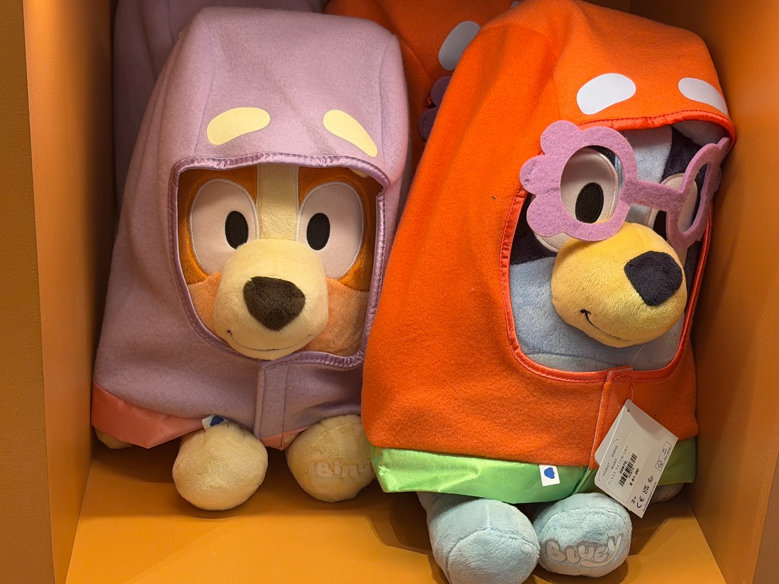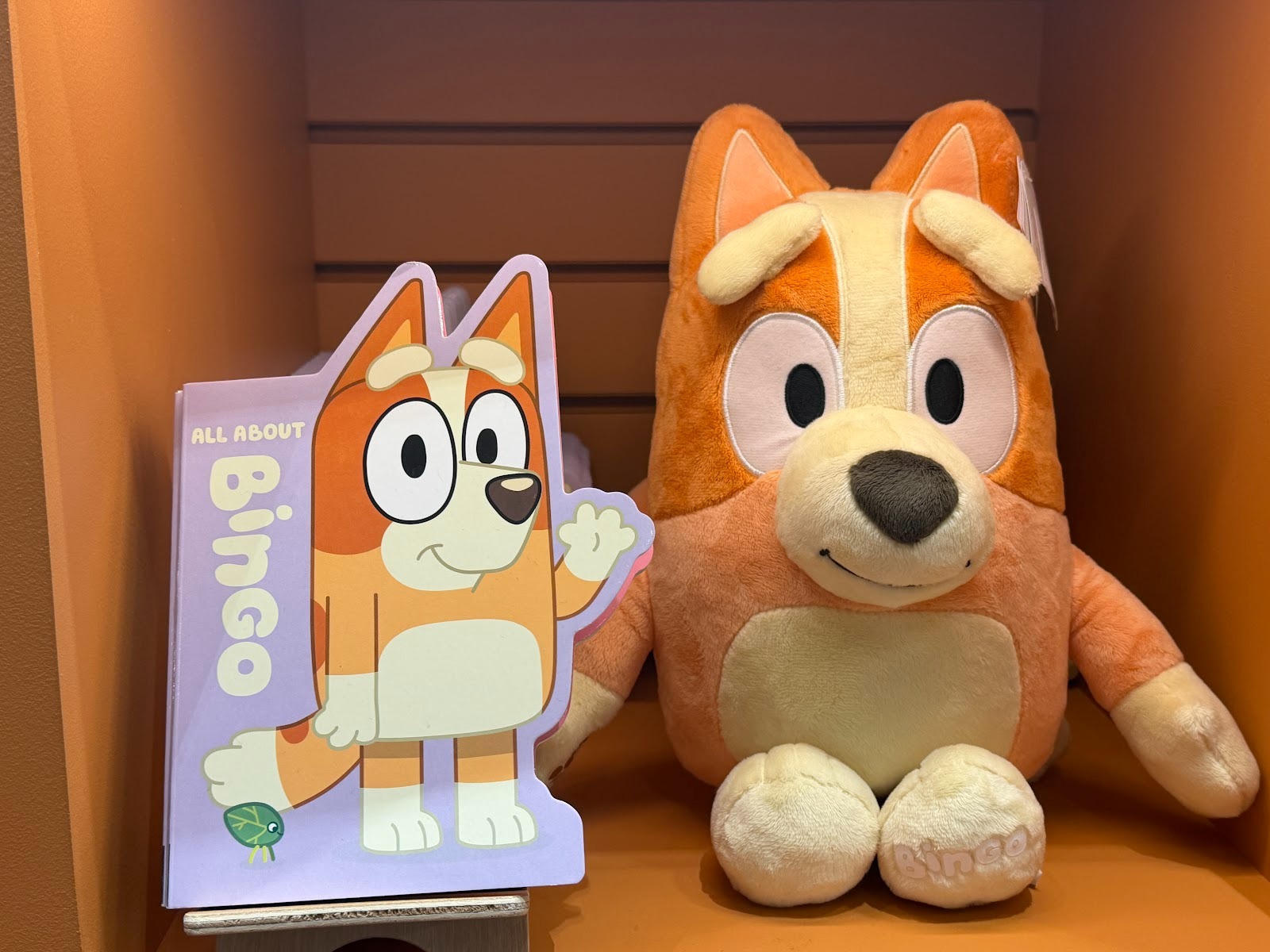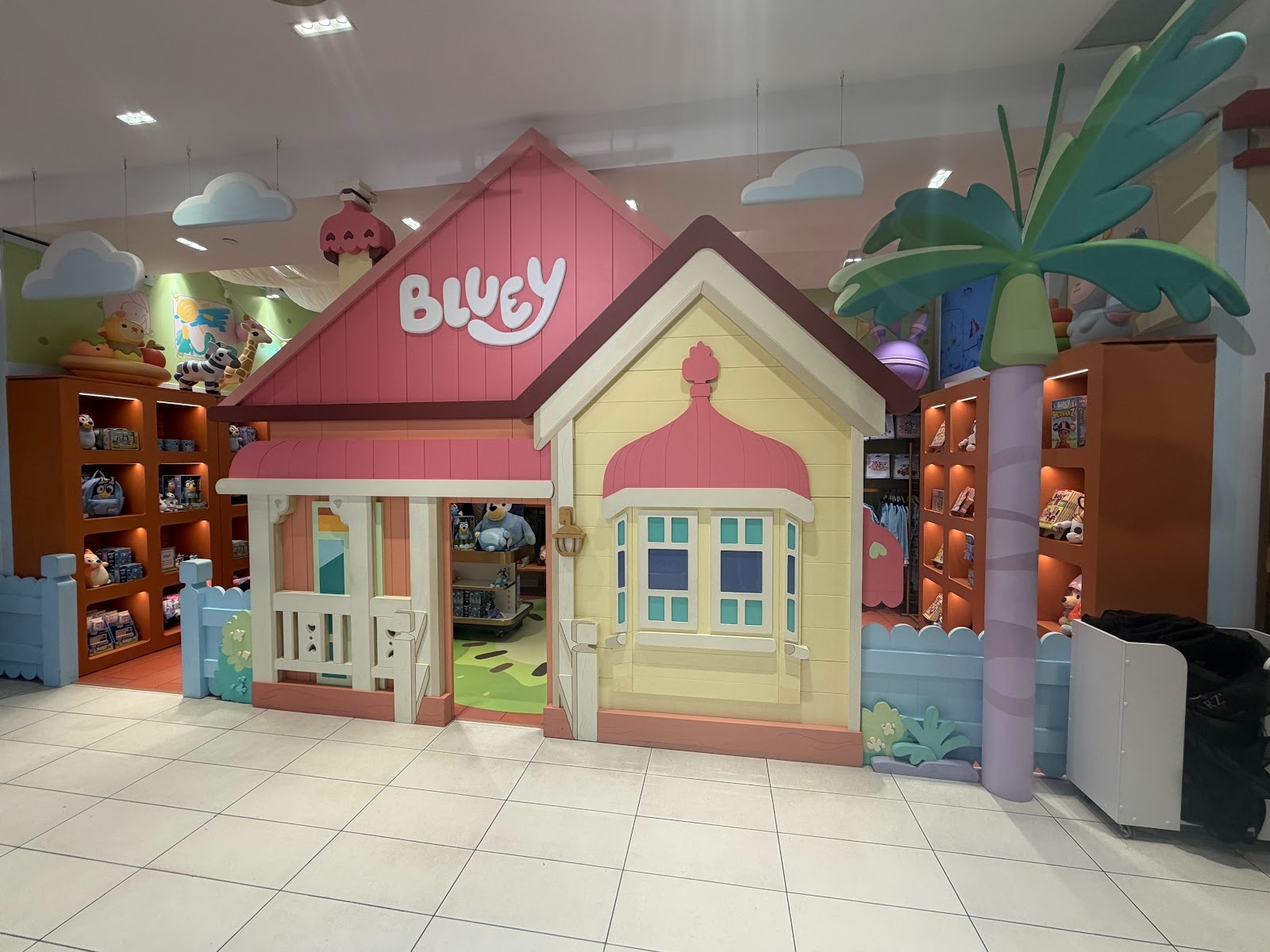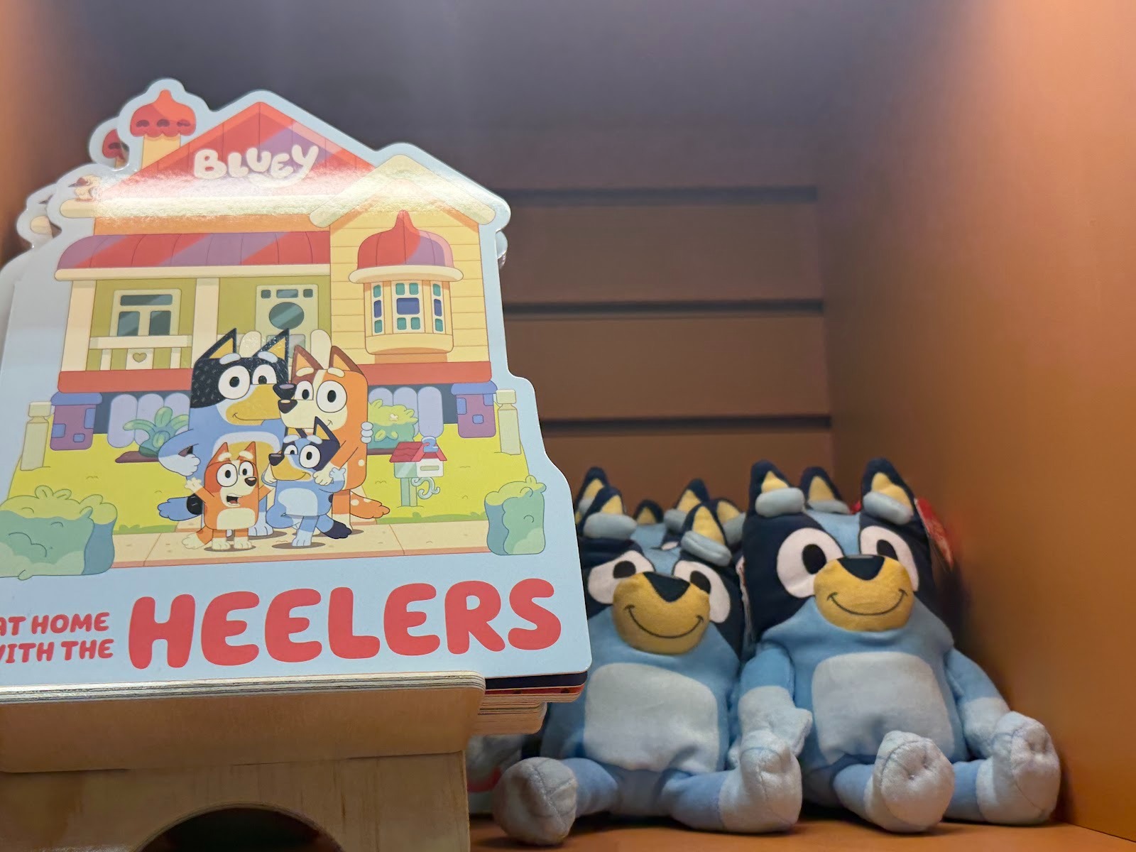 Additionally, there are more Bluey items, including cardboard books and other fun plush and character merchandise scattered throughout a display that looks like their home.