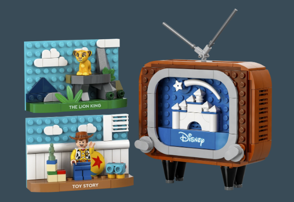 - The set includes a buildable analog TV set with the classic blue and white Disney screen, along with 2 Disney movie scenes.