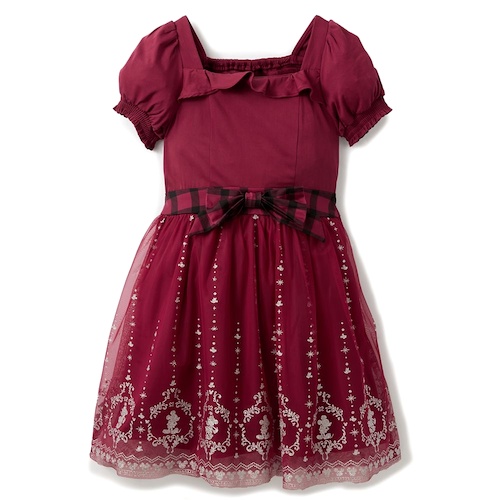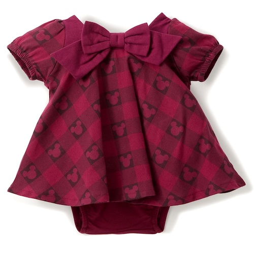 - Then for the ladies there’s a cranberry colored dress with white Minnie Mouse decorations along the skirt, and a ruffled collar across the shoulders, accented with a plaid bow to match the button down shirts.