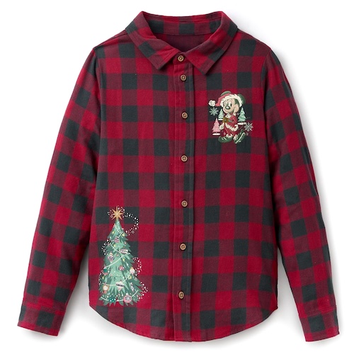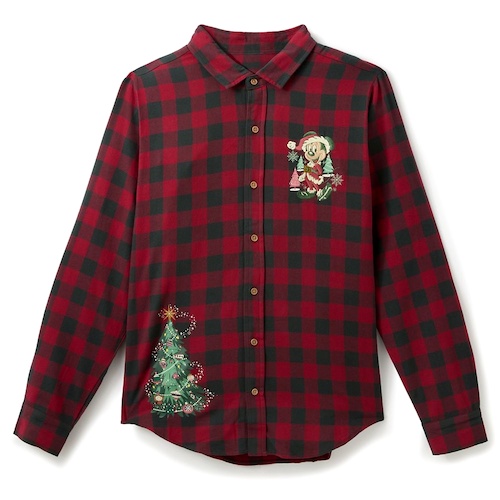 - If flannels are a go to look for your crew, then these button down shirts are sure to be a big hit. Sticking with a traditional buffalo plaid pattern in cranberry red and black the shirts come in adult and kids sizes and include Santa Mickey and Christmas tree embroidery on the front.