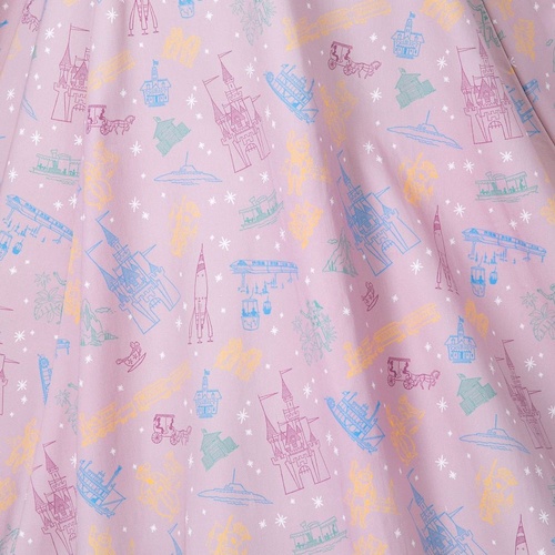 - A removable sash belt rests at the waist and can be tied into a large pink bow. As for the skirt, here’s where the real magic is happening! This portion of the dress features Disneyland icons including Sleeping Beauty Castle, Mad Tea Party Tea Cup, Main Street U.S.A. horse & carriage and more. There’s also an array of little white stars that remind us of pixie dust!