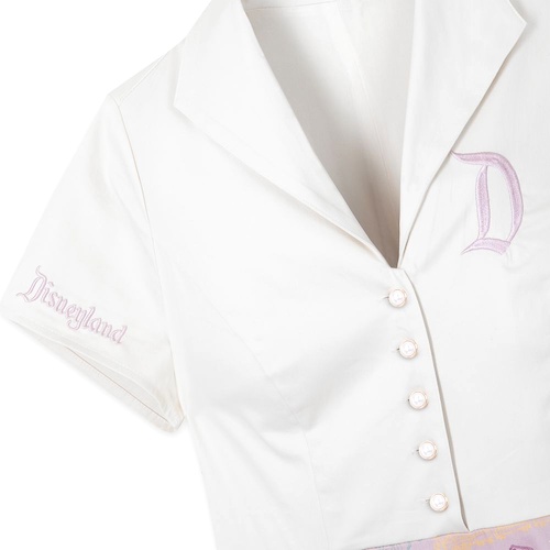 - The dress features a white button-up bodice, V-neck collar with wide lapels, and purple embroidery on the chest and sleeve. The Disneyland “D" is placed on the chest and “Disneyland" accents the sleeve hem.