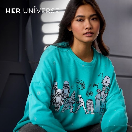- Her Universe is turning their attention to the Skywalker Saga with a focus on character styles from the Original Trilogy. Some apparel features hand-drawn images akin to what one might doodle in a notebook. It’s still classy and totally adorable.