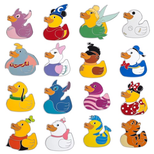 Boost your pin collection with these delightful Ducks of Disney designs available at Disney Store. Each blind pack includes five randomly selected pins from a set of 16 unique rubber ducky character designs.