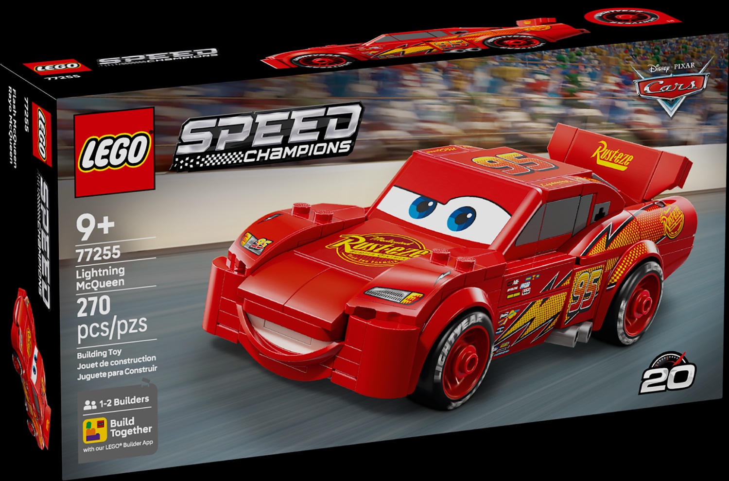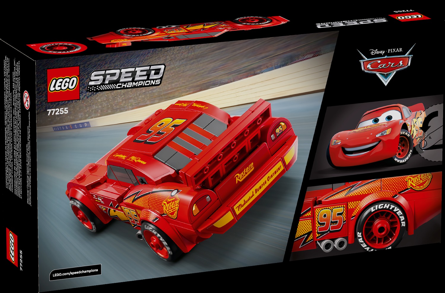 - Details on this LEGO set from the movie version of Lightning McQueen include the character’s famous lightning bolt, stickers for his headlights, number 95, and the instantly recognizable Rust-Eze sponsor logo on his hood and Lightyear logo on his tires. Notably, LEGO says that the Lightning McQueen model is the only Speed Champions set so far to incorporate a detailed undercarriage.