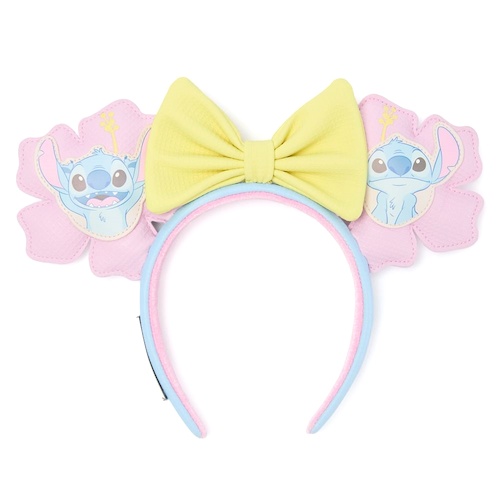 - Not feeling the backpack look? That’s okay, there’s a Pastel Ear Headband too! The ears are hibiscus flowers and Stitch is pictured with two different expressions on each ear. Completing the look is a giant yellow bow for a fun summery style.