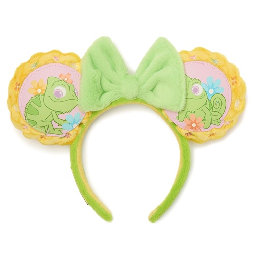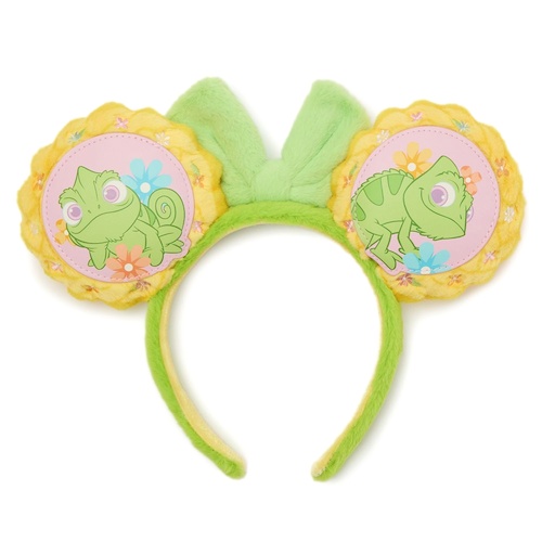 - Not feeling the backpack look? That’s okay, there’s a Pastel Ear Headband too! The ears feature Pascal smiling in front of a pretty pink background. He’s surrounded by flowers and a golden frame that looks like Rapunzel’s braided hair..