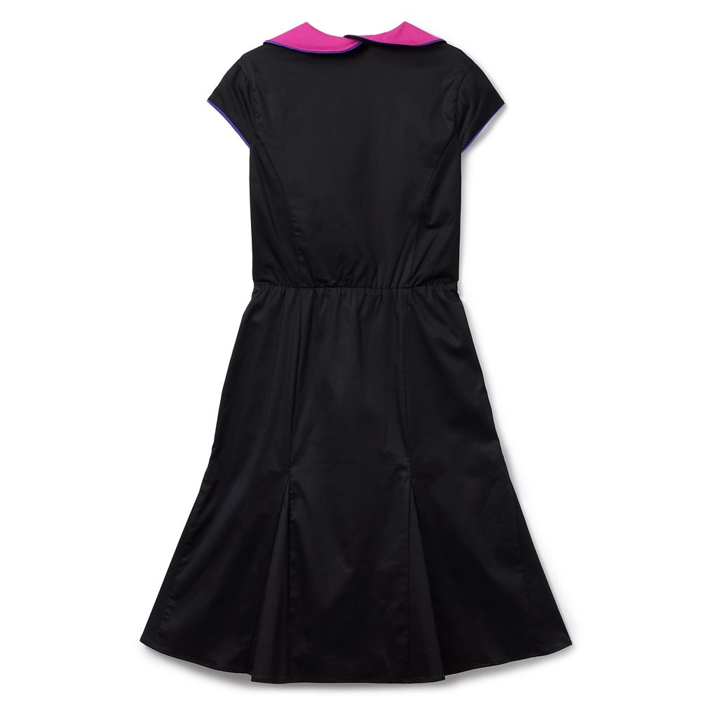 - This solid black dress features a natural waist with a flair skirt that opens to reveal bright patches of pink fabric. Along the front hemlines are purple piping for a dramatic effect, while purple thorn and horns embroidery embellish the collar.