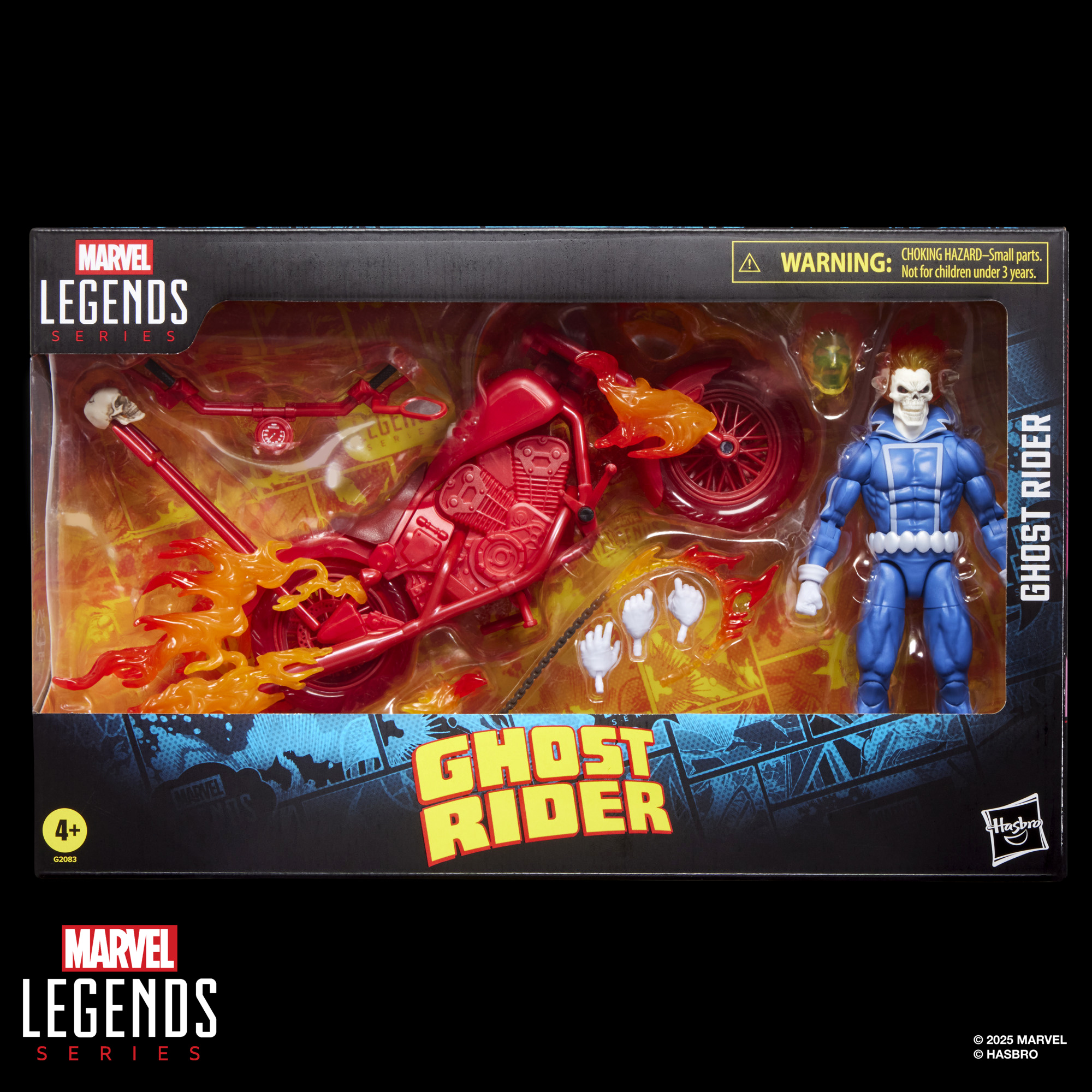 This action figure set comes with 7 pieces: alternate flaming skull, 3 alternate hands, chain, and Ghost Rider’s iconic fiery-red motorcycle with flame detail. Hasbro Marvel action figures' 6-inch scale make them great for posing and displaying in fans' collections. Pose Ghost Rider tearing down the highway on his motorcycle or exacting fiery vengeance and reimagine Ghost Rider comics-inspired scenes on your shelf with Marvel Legends action figures and Marvel collectibles (each sold separately, subject to availability).
