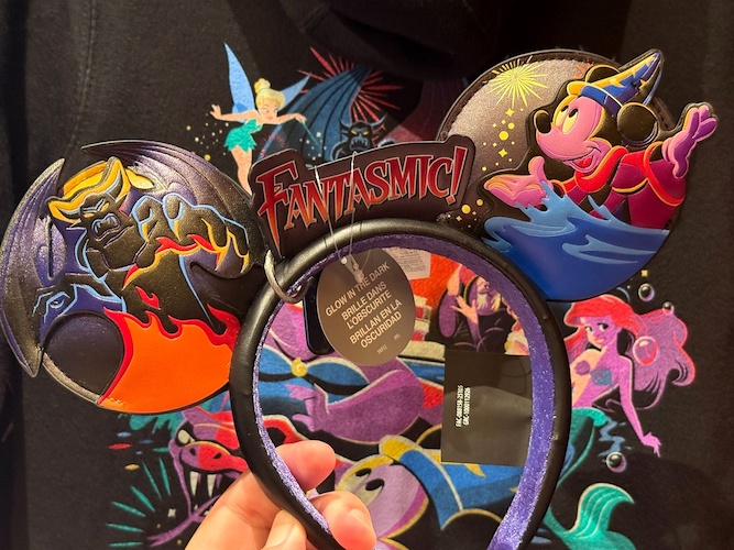 A new collection of Fantasmic! merchandise has arrived at Disney’s Hollywood Studios. Visitors to the Walt Disney World theme park can recall their memories of the iconic show with a new collection which features a pair of mouse ears, a shirt and a hoodie. We spotted these items at the Once Upon a Time store along Sunset Blvd.
