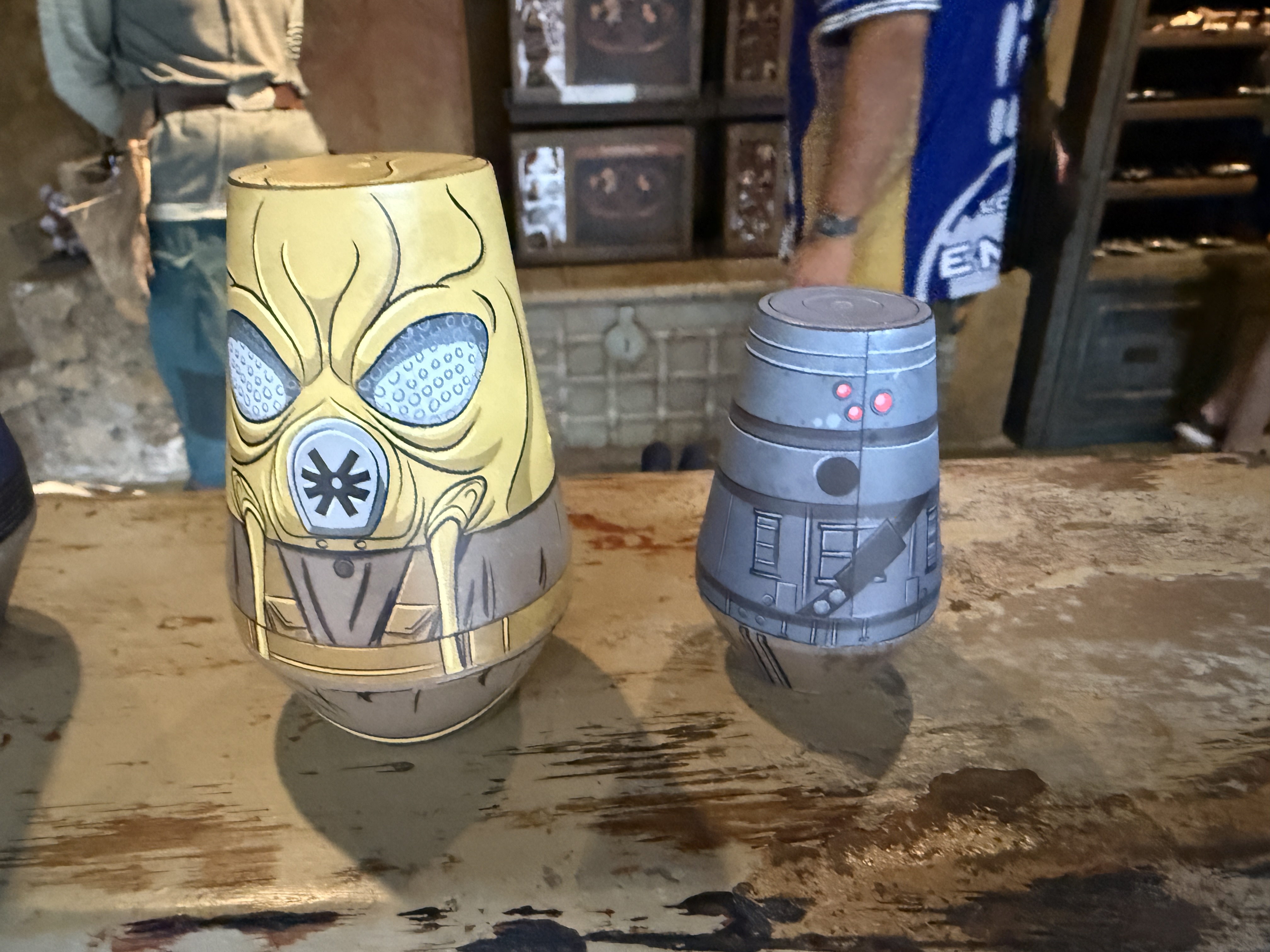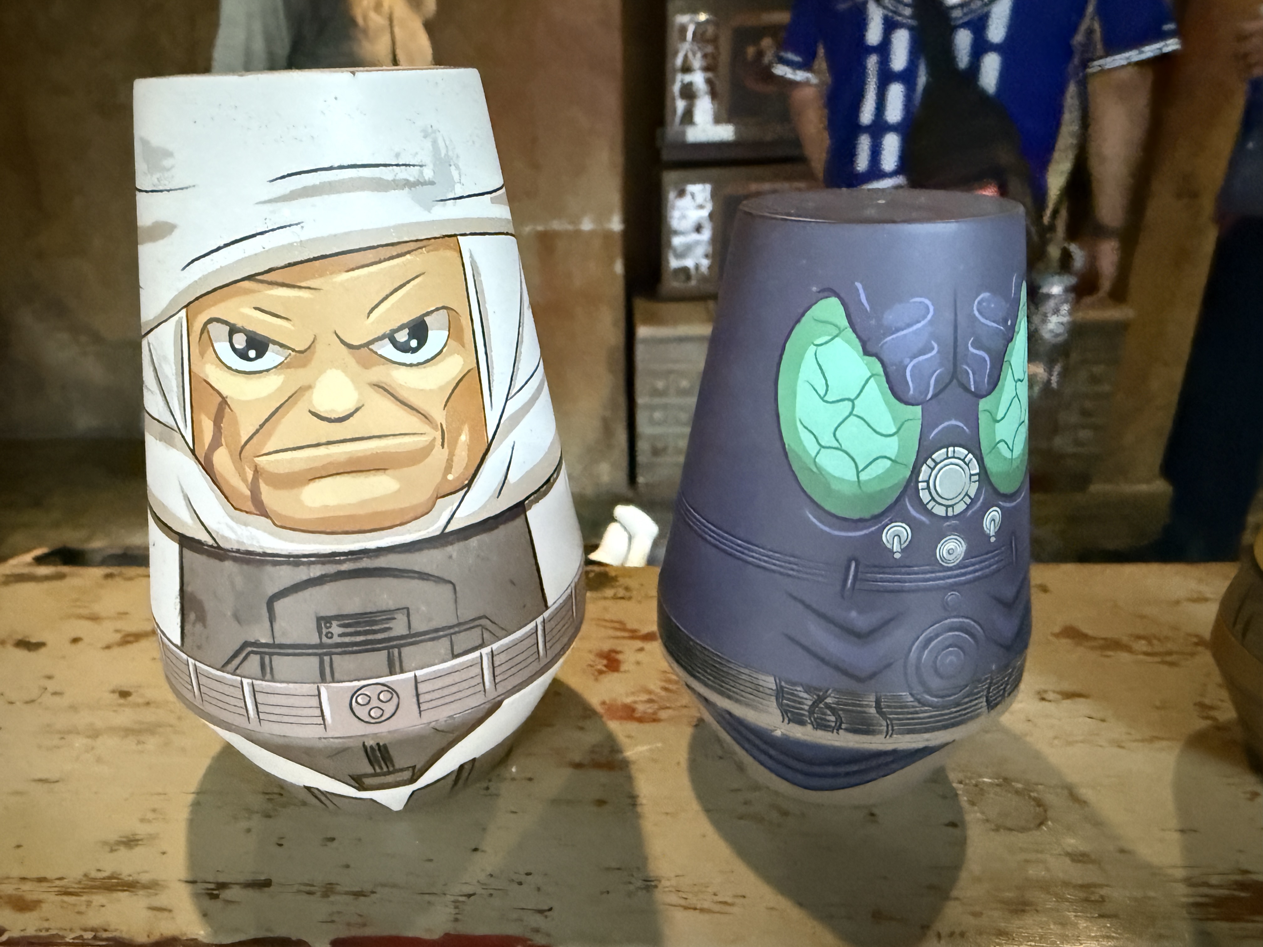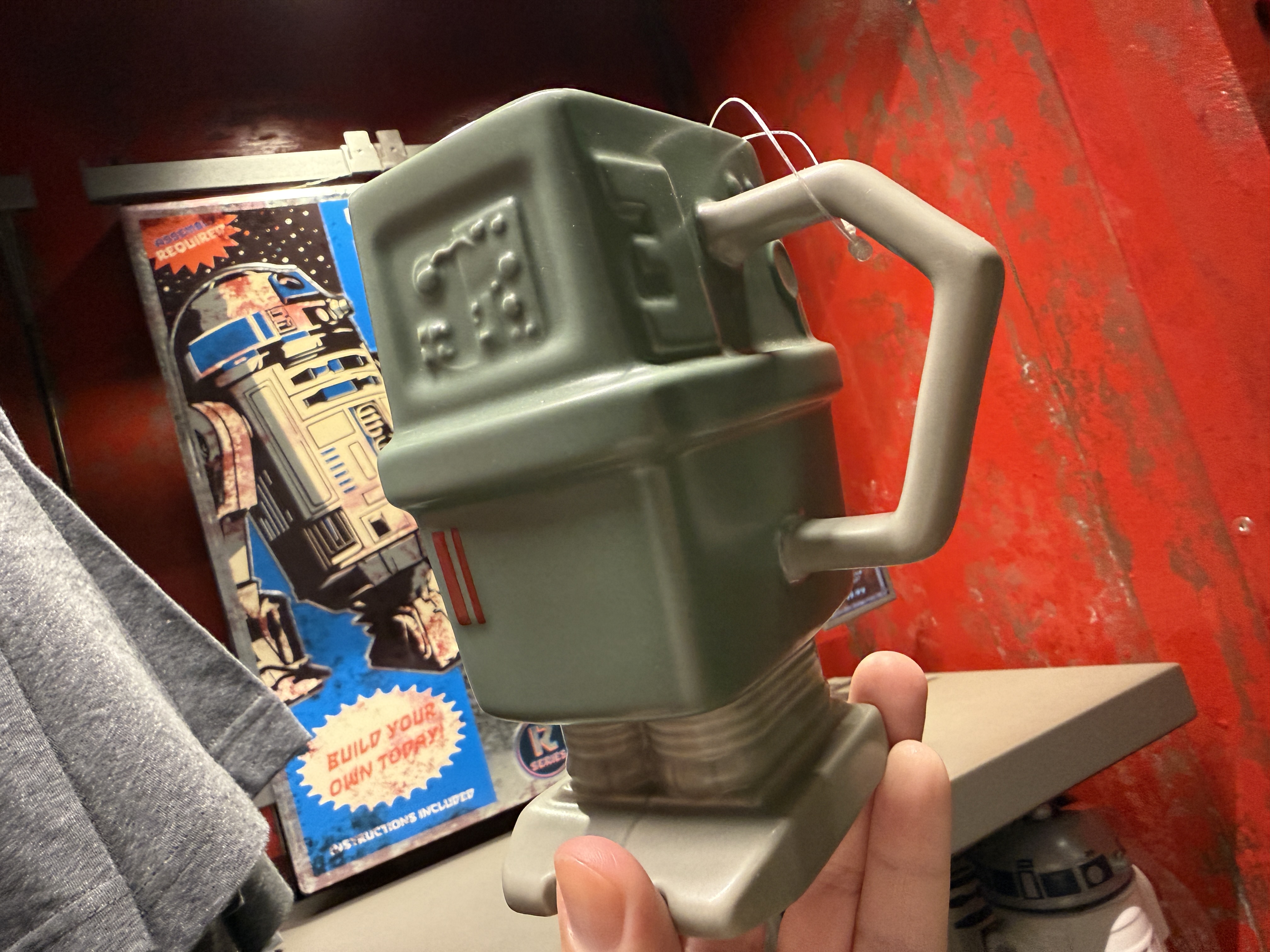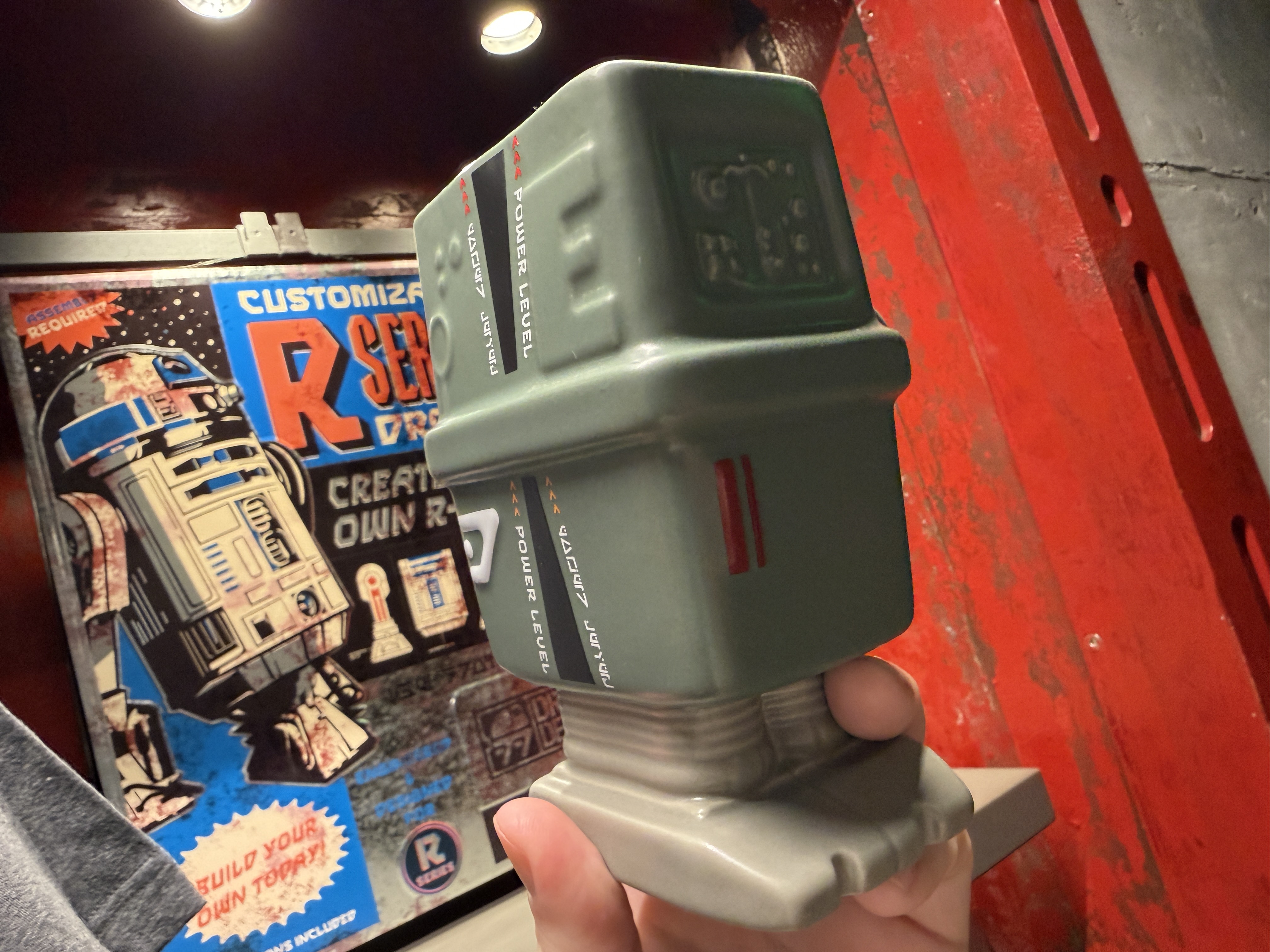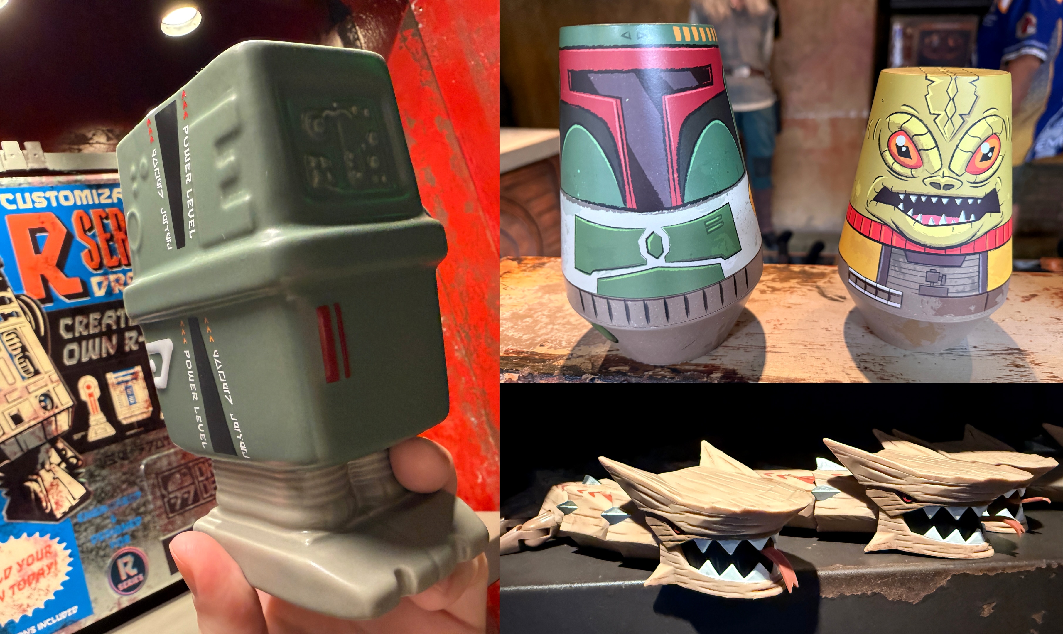 During a recent trip to the Walt Disney World theme park, we spotted some new items for sale at the shops of Batuu. First is this ceramic Gonk Droid mug, available at the Droid Depot for $27.99. A unique feature is that the power bar on the side of the mug changes color when warm liquids are added.