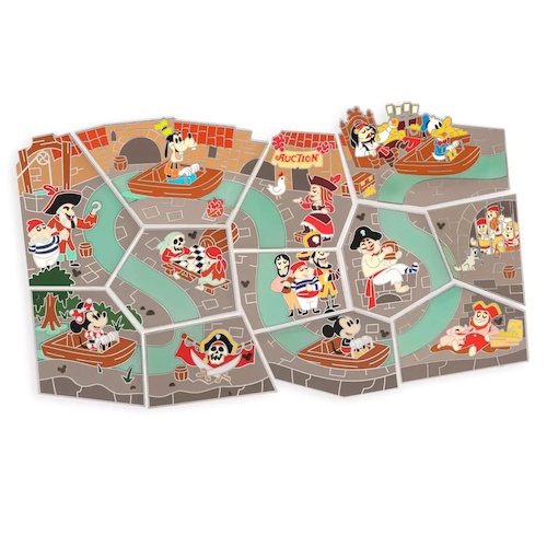 Explore the exclusive pin puzzle set at Disney Store, showcasing a beautifully illustrated design of the Pirates of the Caribbean attraction.
