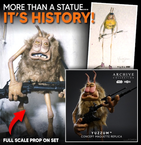 - “Yuzzum is one of the largest Return of the Jedi maquettes, at approximately 11 1/8″ tall (including the wood display base). Each resin maquette is 100% made in the U.S.A. and features customized faux fur from the same source used by the creature makers back in 1983. Every replica in this edition is meticulously hand painted by the artists in our New York studio, making each a unique tribute to the artistry involved behind the scenes of our favorite films!"