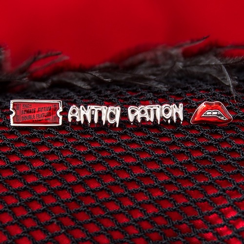 This earring set of four includes a “Science Fiction, Double Feature" ticket, referencing the film’s opening song, the Rocky Horror lips, and two other earrings that amusingly echo the moment in the film where Frank (Tim Curry) puts an amazingly long pause in the middle of a certain word, with one reading “ANTICI and the other “PATION."