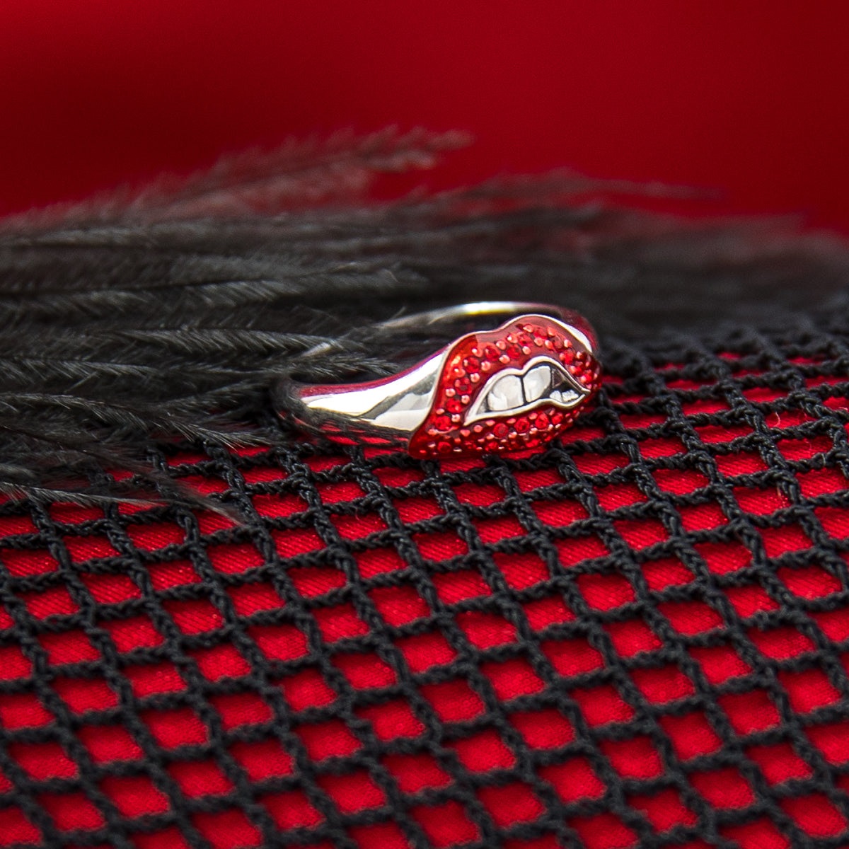 No, no, not a ring for your lip, this is a ring for your finger featuring the iconic Rocky Horror lips from the film’s poster and opening credits. Featuring 25 scarlet red cubic zirconia crystals set atop glossy red enamel.