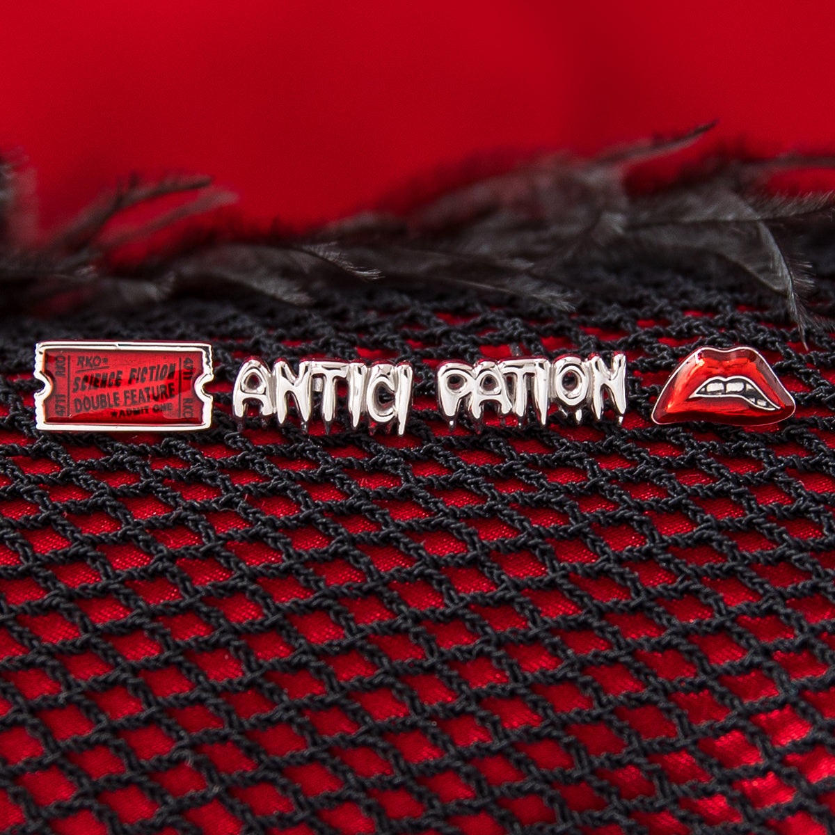 This earring set of four includes a “Science Fiction, Double Feature" ticket, referencing the film’s opening song, the Rocky Horror lips, and two other earrings that amusingly echo the moment in the film where Frank (Tim Curry) puts an amazingly long pause in the middle of a certain word, with one reading “ANTICI and the other “PATION."
