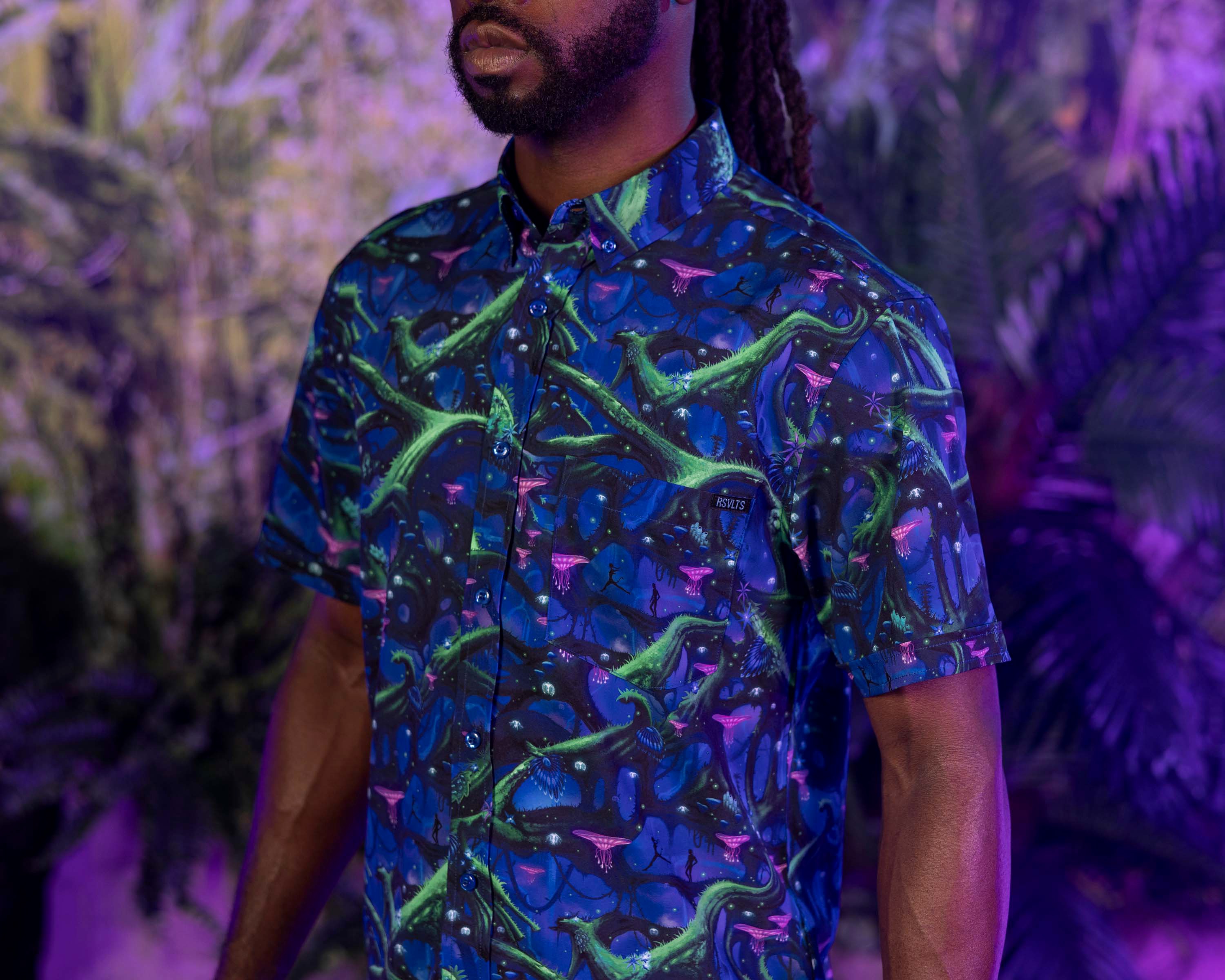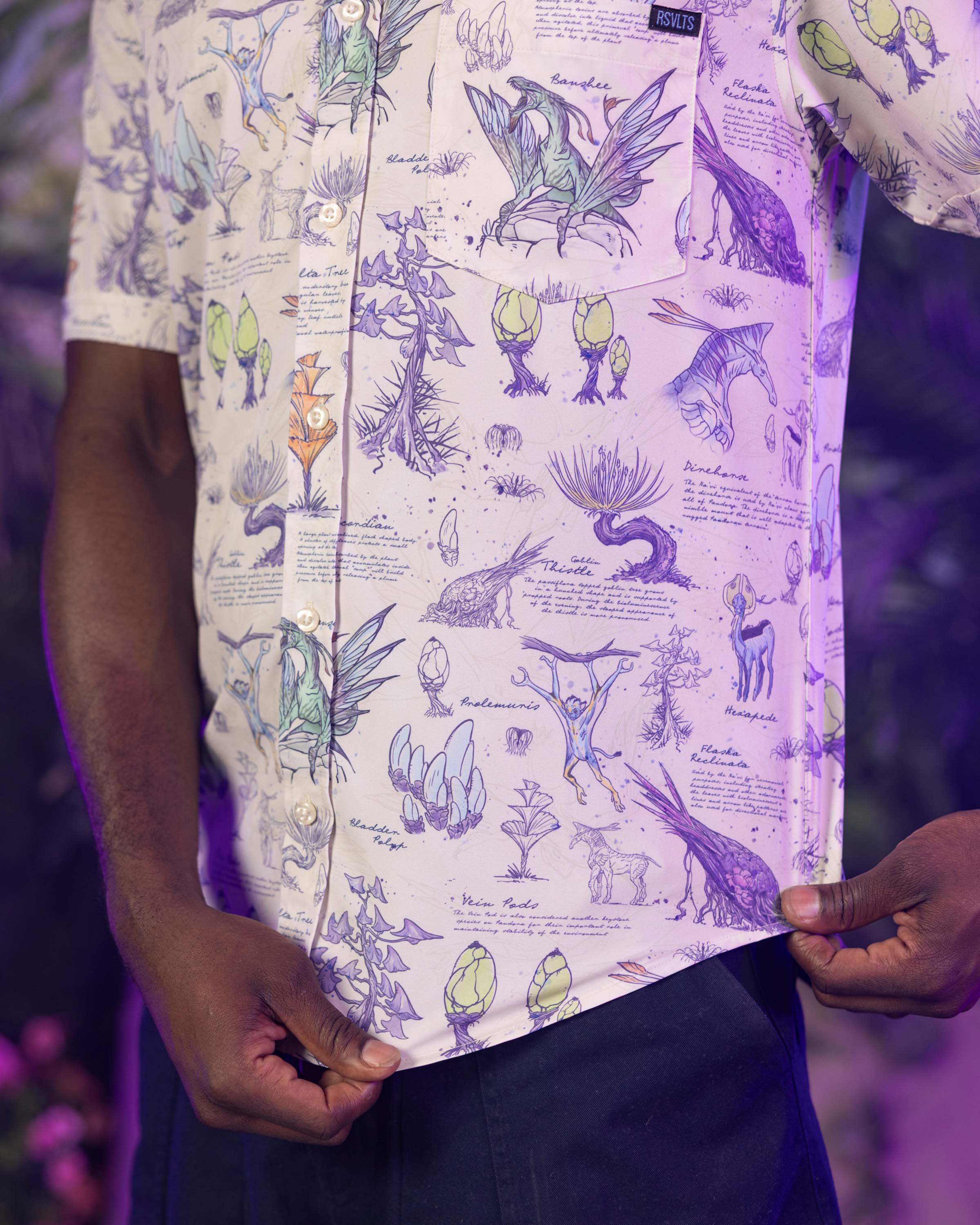 Then, when it comes to the button down shirts, fans will appreciate 5 incredible looks, including a "camo" look that the RDA would embrace, textbook drawings and details about the life forms of Pandora, and even a style inspired by the Na'vi appear at night.