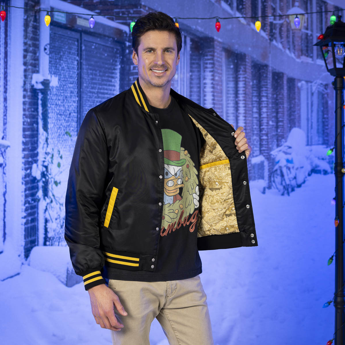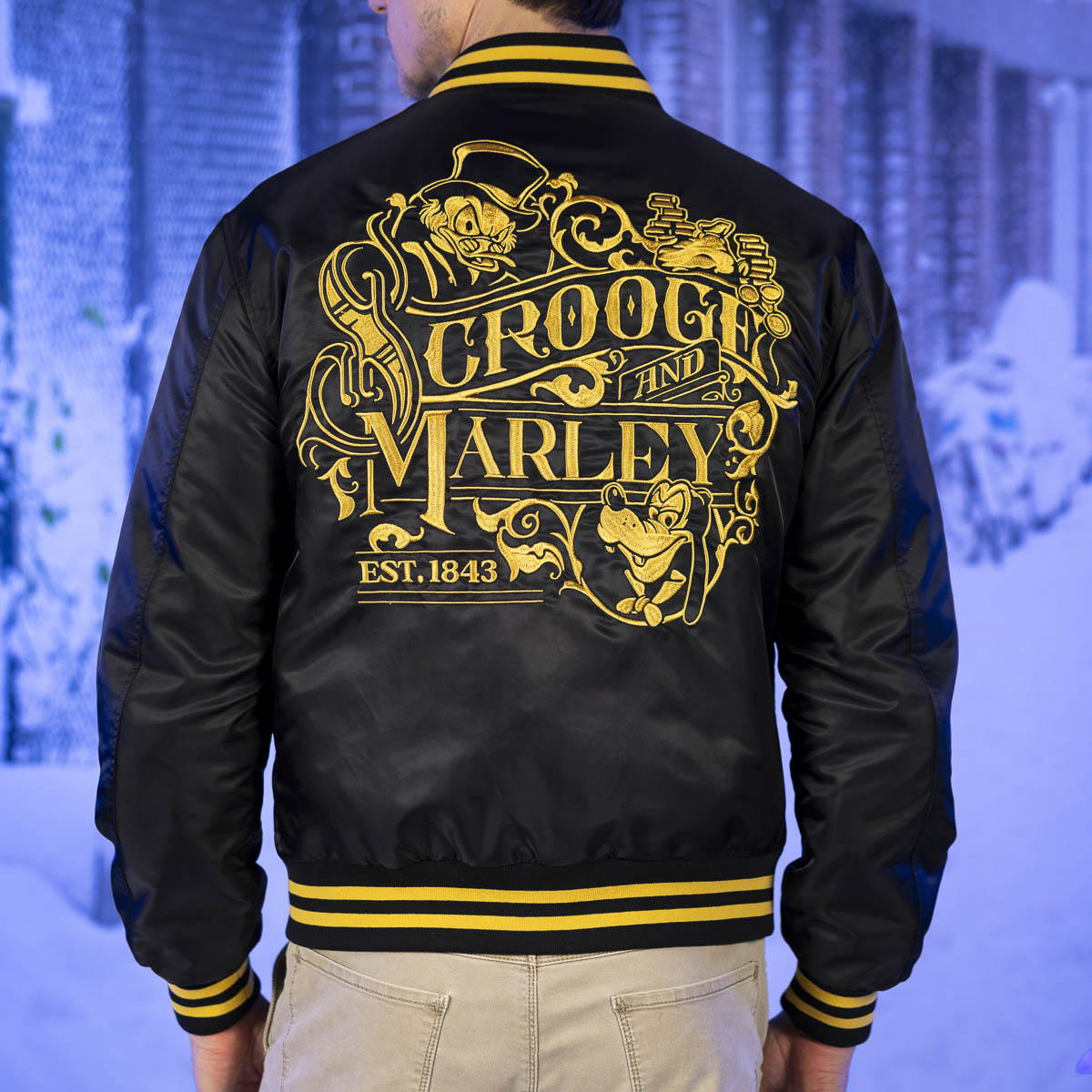 The Coach Jacket is black with shiny flourishes depicting Scrooge and Marley's business on the back. Inside, this lining is dedicated to Scooge's monstrous piles of coin. Speaking of Scrooge, he stars on one of the crewneck tees, appropriately titled “Bah Humbug!”