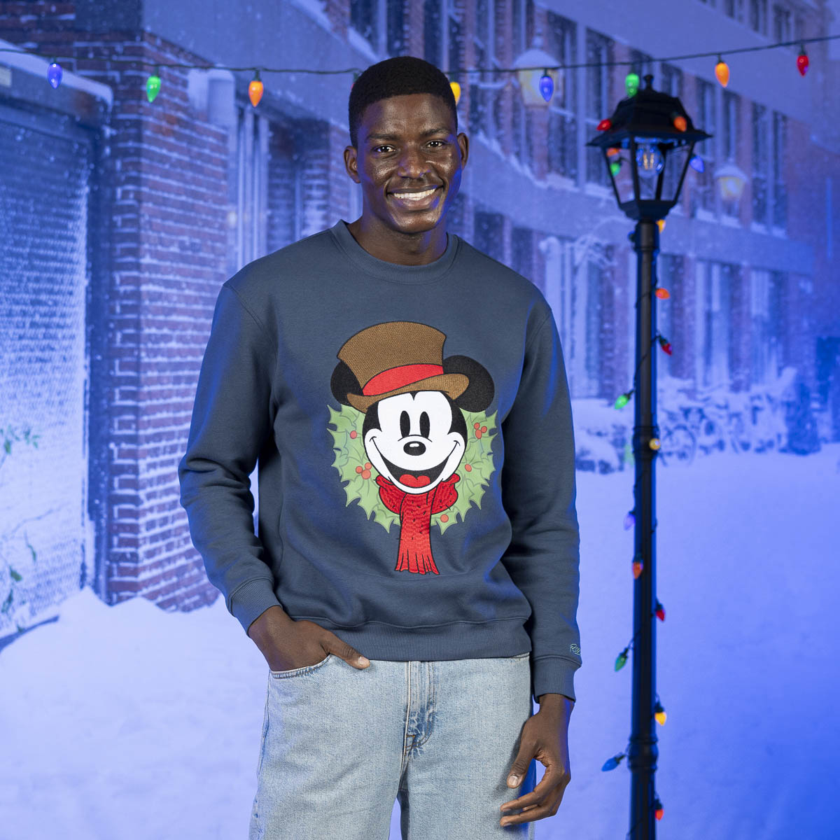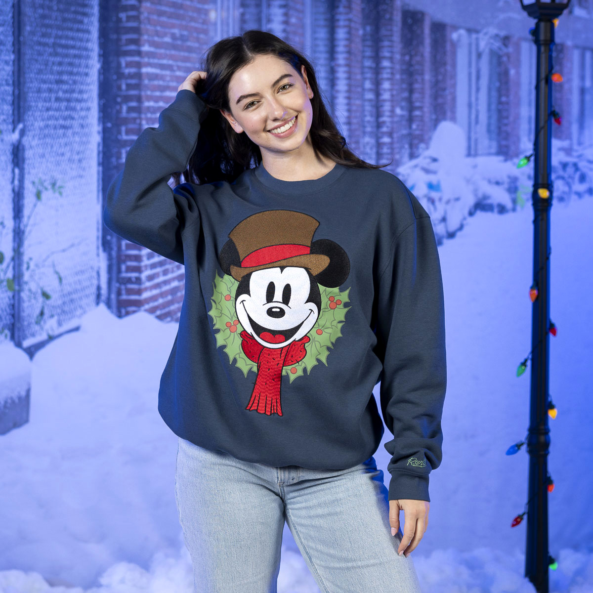 Spread good cheer when you wear this warm crewneck sweatshirt featuring Mickey Mouse. The crewneck sells for $75.
