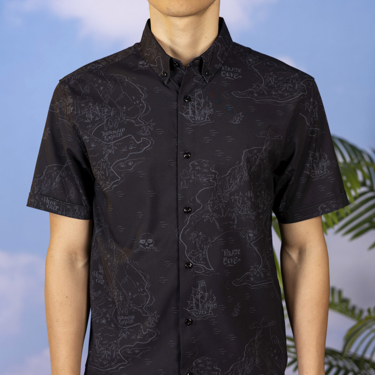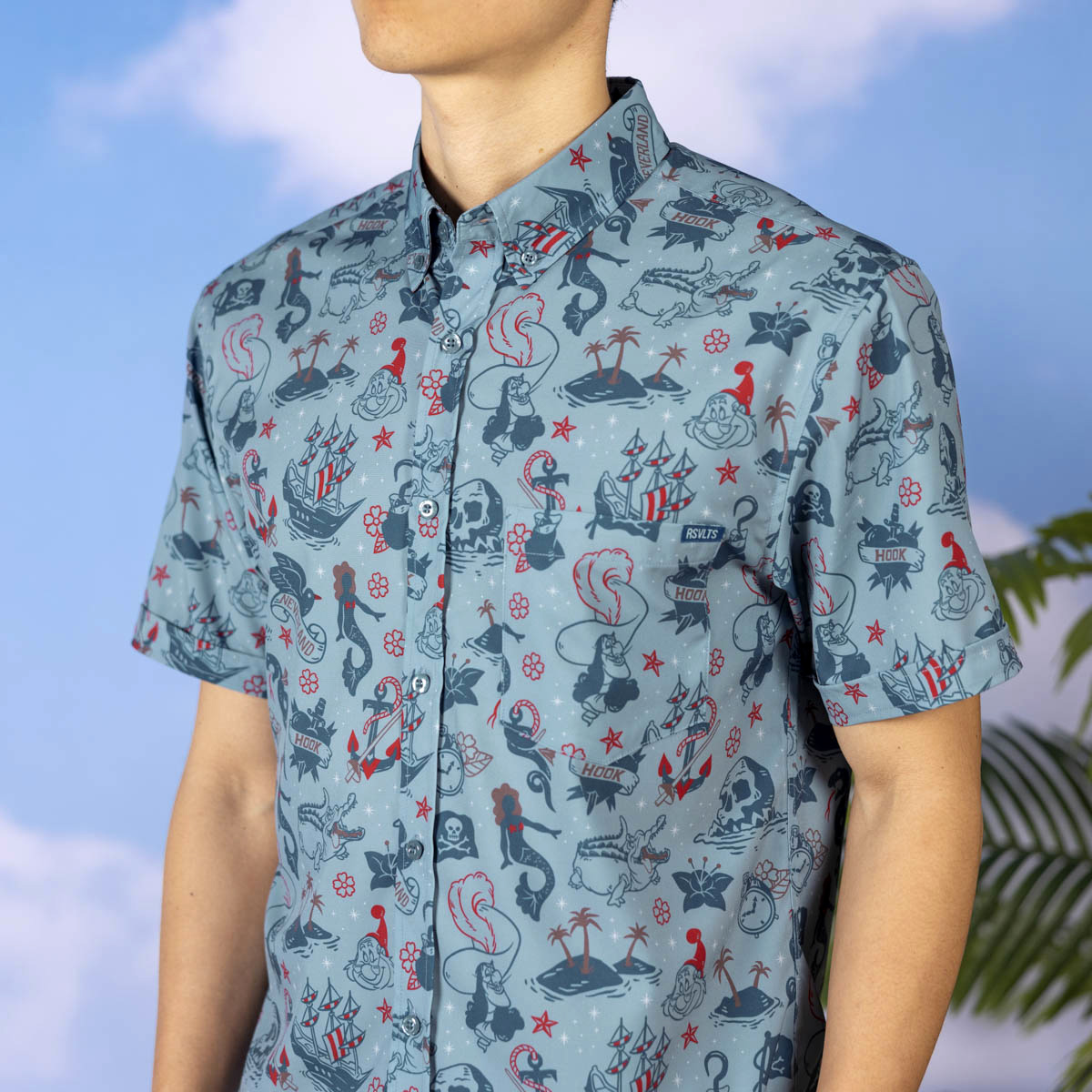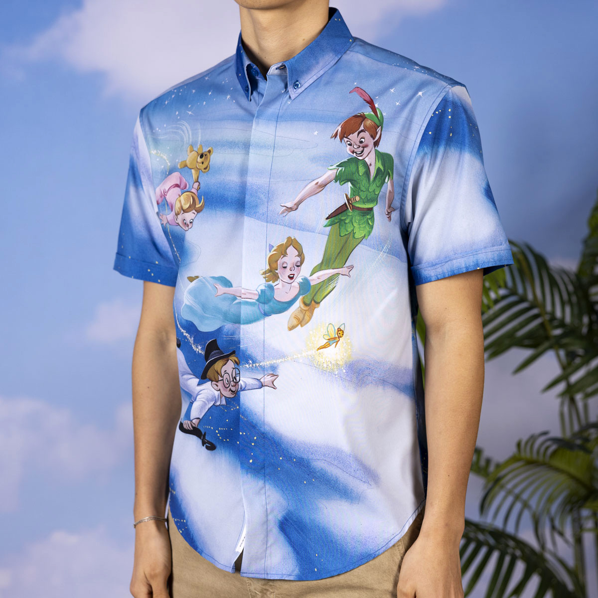 The lineup features a colorful palette decorated with characters and icons from Disney's animated classic, and the standout piece is "Faith, Trust & Pixie Dust,” a full-panel button down of Peter and Darling children (Wendy, Michael, and John), flying across the sky. Another fun offering is "Hook’d It," a blue shirt covered in nautical elements like pirate ships, flags, mermaids, anchors, and more. Of course, Captain Hook and Mr. Smee are here too, and each icon is presented in the stylings of a tattoo!