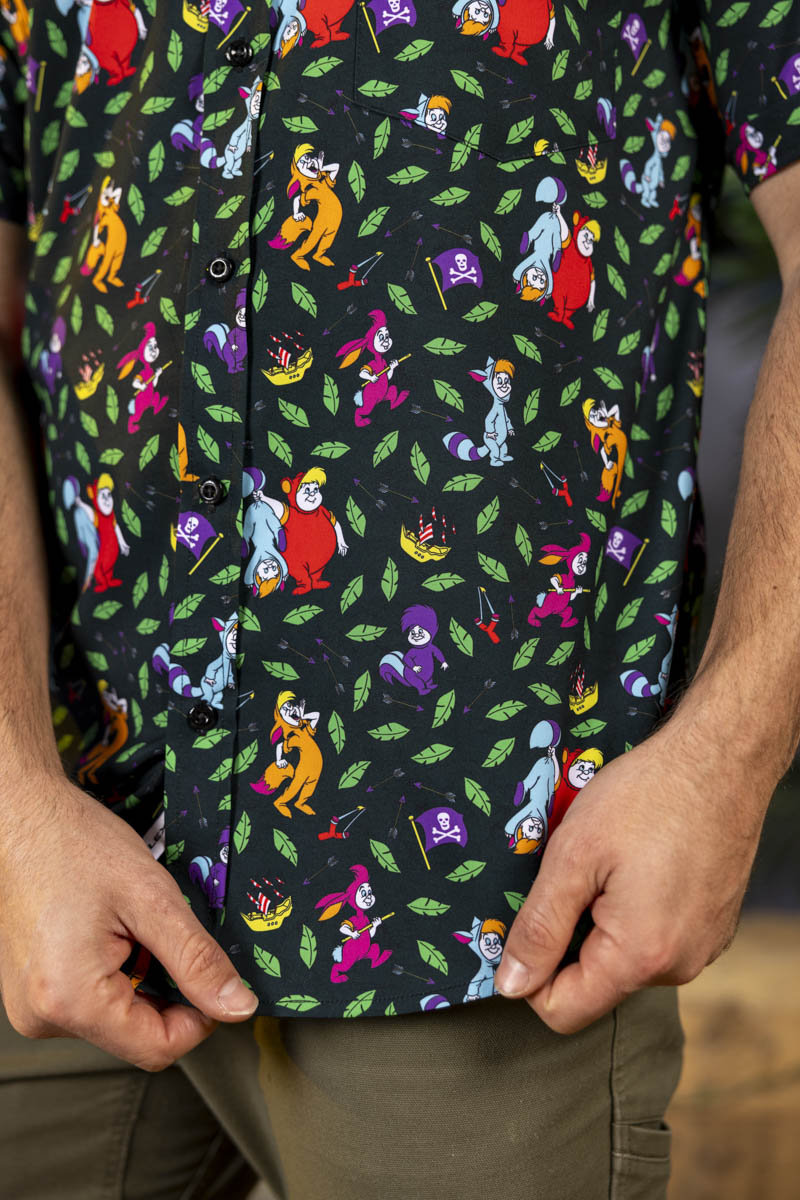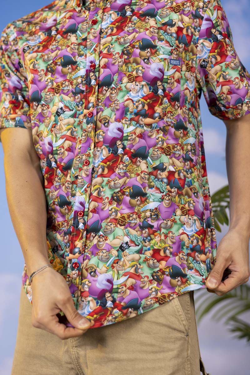 The lineup features a colorful palette decorated with characters and icons from Disney's animated classic, and the standout piece is "Faith, Trust & Pixie Dust,” a full-panel button down of Peter and Darling children (Wendy, Michael, and John), flying across the sky. Another fun offering is "Hook’d It," a blue shirt covered in nautical elements like pirate ships, flags, mermaids, anchors, and more. Of course, Captain Hook and Mr. Smee are here too, and each icon is presented in the stylings of a tattoo!