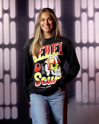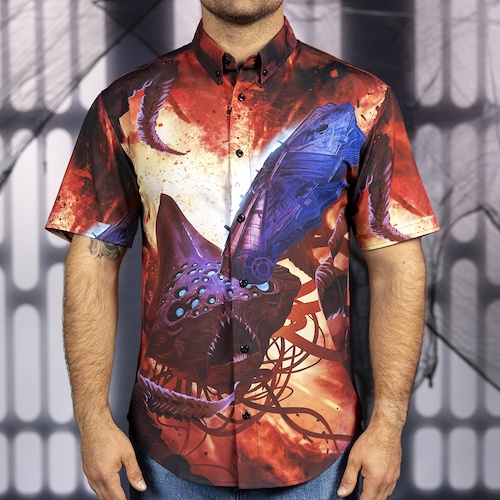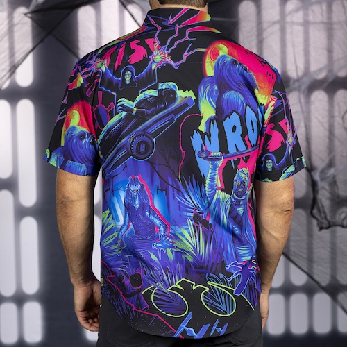 Two other standout pieces in the collection are full panel shirts with “Kessel Run" showing the Millennium Falcon outrunning the large monster; and “Hyperglow Horrors" highlighting iconic moments from the Skywalker Trilogy reimagined as scenes from a horror film. Best of all the neon coloring gives it a playfully spooky vibe.