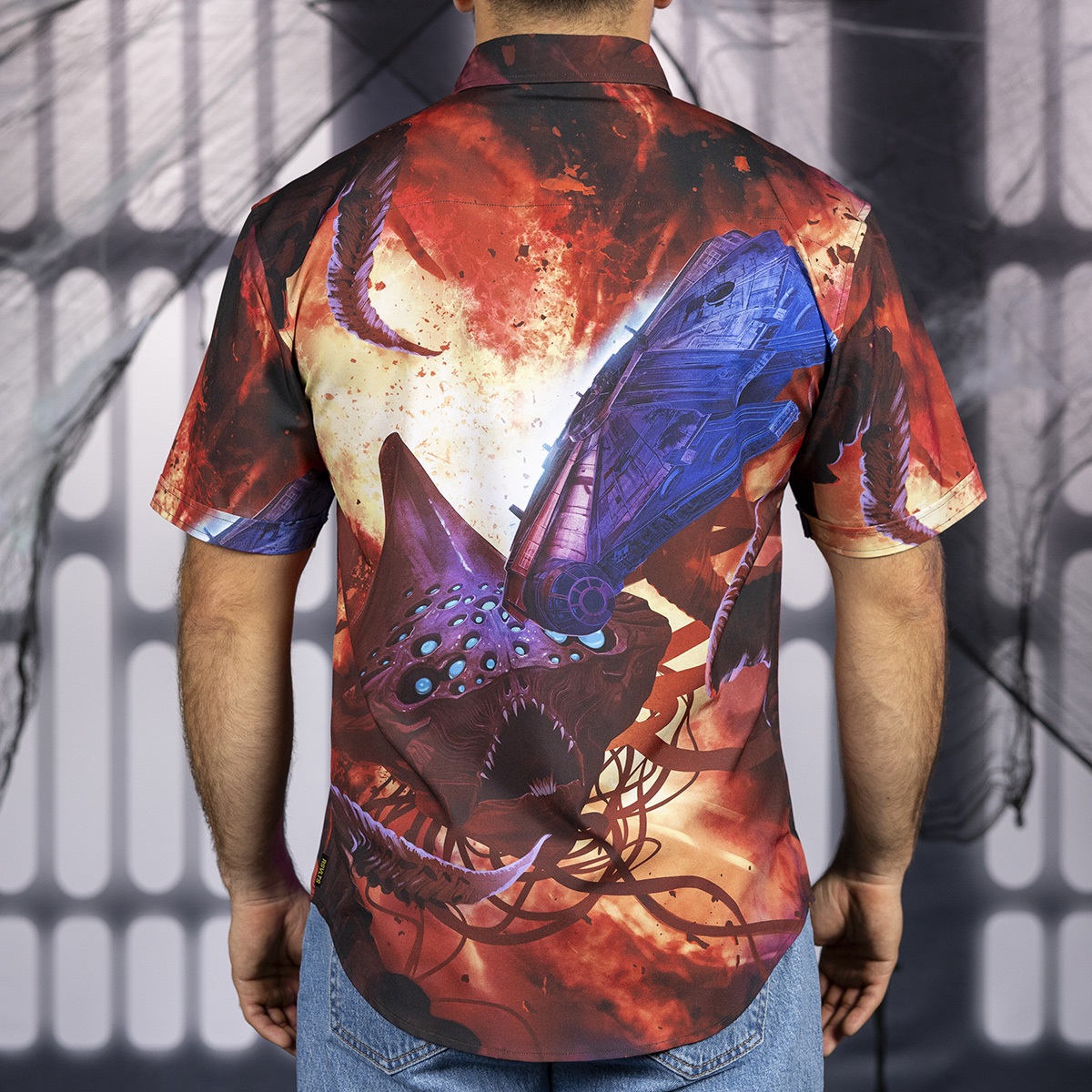 Two other standout pieces in the collection are full panel shirts with “Kessel Run" showing the Millennium Falcon outrunning the large monster; and “Hyperglow Horrors" highlighting iconic moments from the Skywalker Trilogy reimagined as scenes from a horror film. Best of all the neon coloring gives it a playfully spooky vibe.
