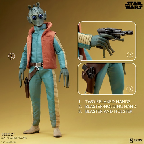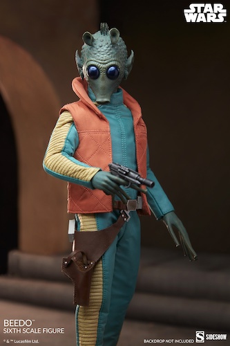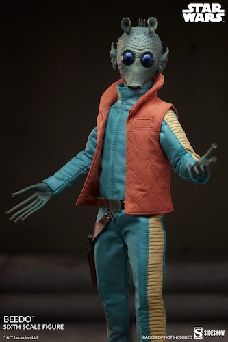 Look, the Star Wars franchise has incorporated a lot of pretty ridiculous supporting and background characters over the years, but one of the most absurd might just be Beedo. This guy is virtually identical to his cousin Greedo, except he wears an orange vest with a collar, instead of an orange vest with… no collar. Anyway, Beedo might not be nearly as much of a household name as his cousin is, but now he’s got a sixth-scale collectible figure from Sideshow that you can add to your collection… should you so desire.