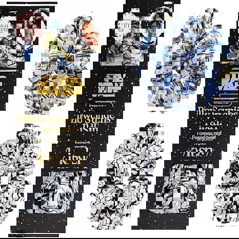Star Wars Accessories from Kitsch: Rebel Alliance Satin Pillowcase ($22.00), R2-D2 & C-3PO Satin Pillowcase ($22), Galactic Empire Satin Pillowcase ($28.00), Darth Vader & Stormtroopers Satin Pillowcase ($28.00), Light Side vs. Dark Side Satin Flexi Rods ($18.00), R2-D2 & Stormtrooper Pillow Scrunchies In Satin ($19.99), C-3PO Glitter Cloud Clip ($12.00), R2-D2 Glitter Cloud Clip ($12.00), Darth Vader Glitter Cloud Clip ($12.00), Stormtrooper Glitter Cloud Clip ($12.00) - Wow! Kitsch makes a lot of really nice Star Wars home goods and hair supplies. My wife was thrilled when I brought these home.