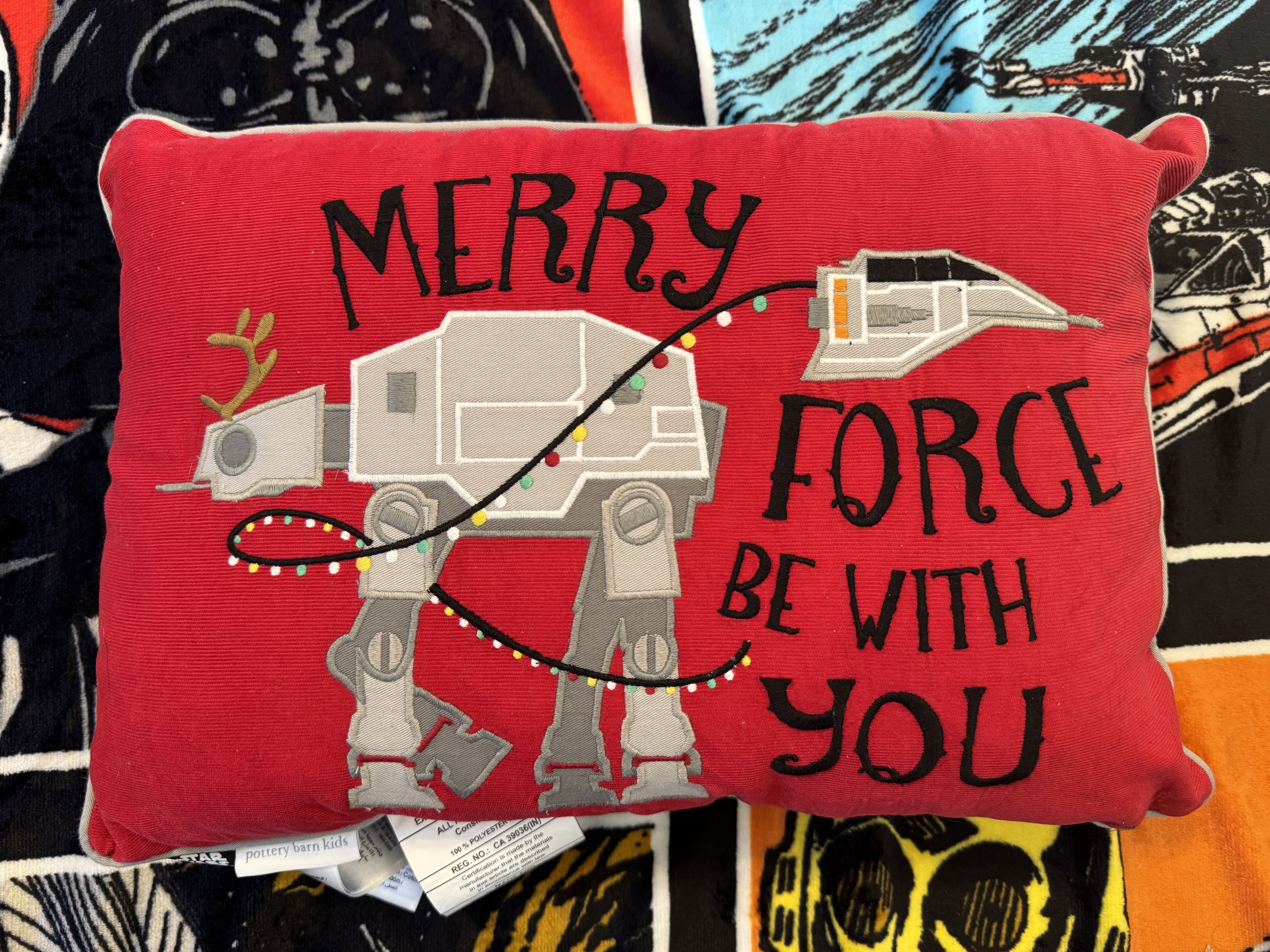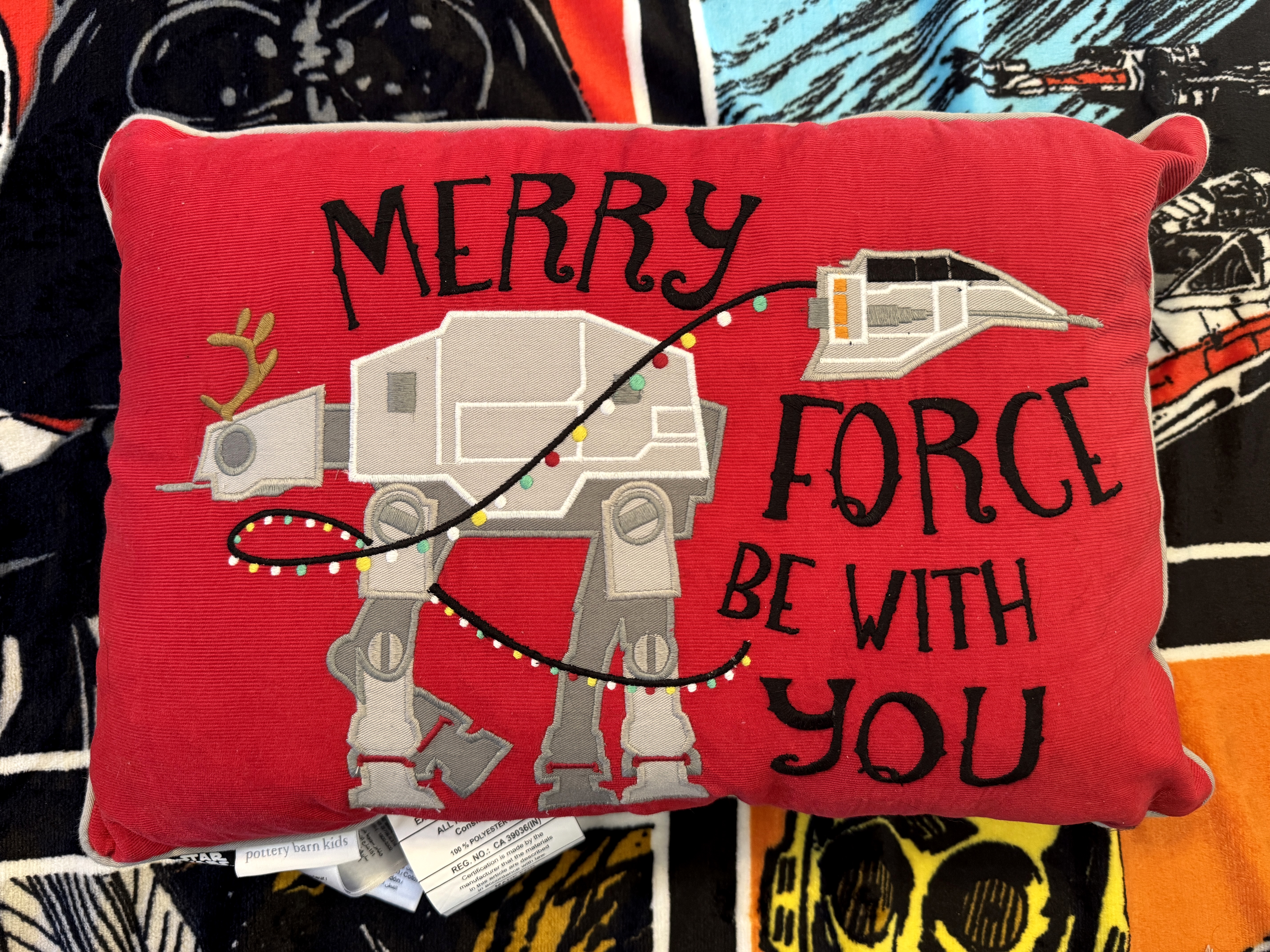 Star Wars Christmas Pillow from Pottery Barn Kids ($44.50) - Speaking of stuff that would look nice on couches, you can wish "Merry Force Be with You" to visitors during the holiday season with this decorative pillow featuring an AT-AT reindeer and a Snowspeeder trailing a string of Christmas lights.