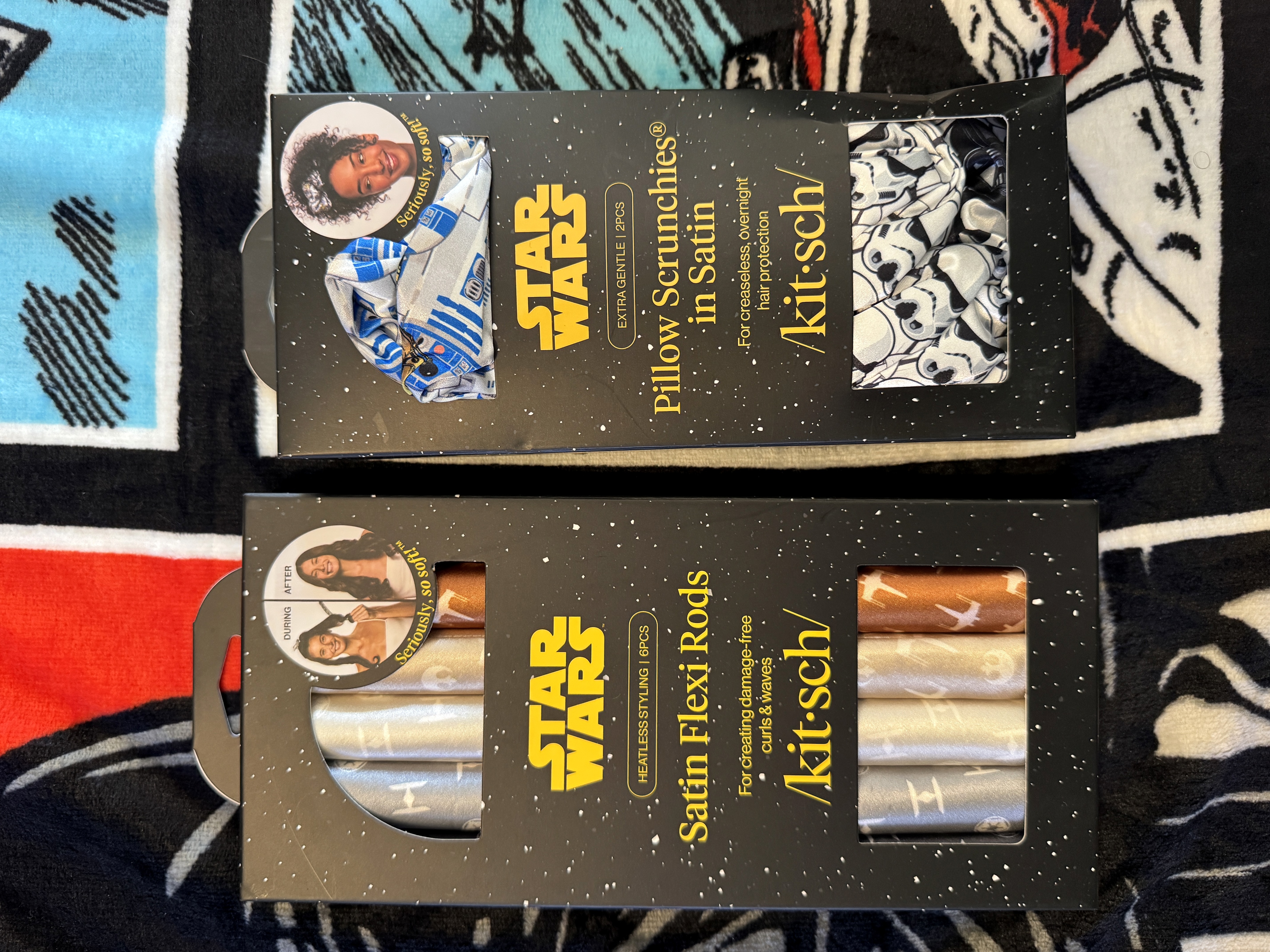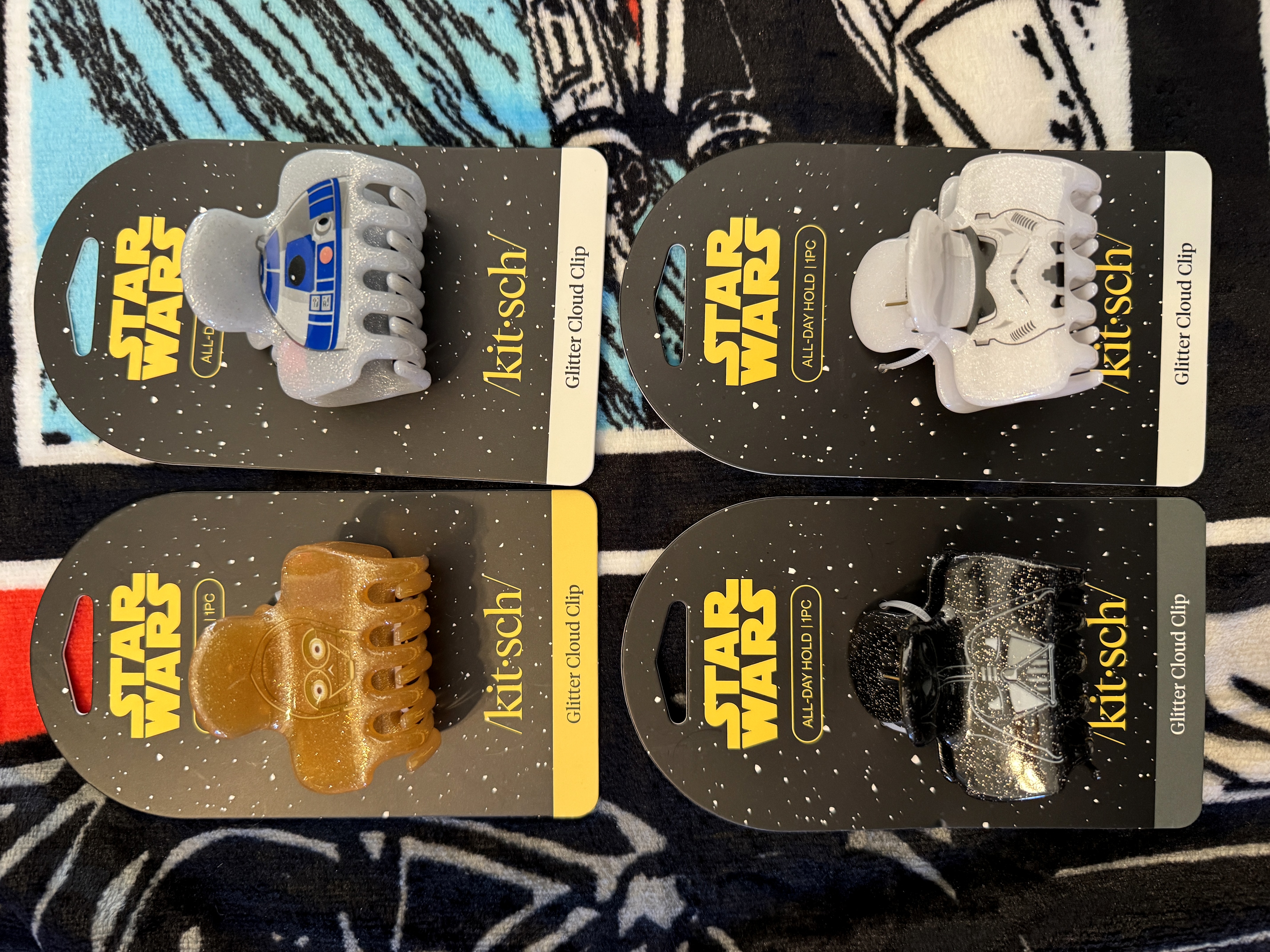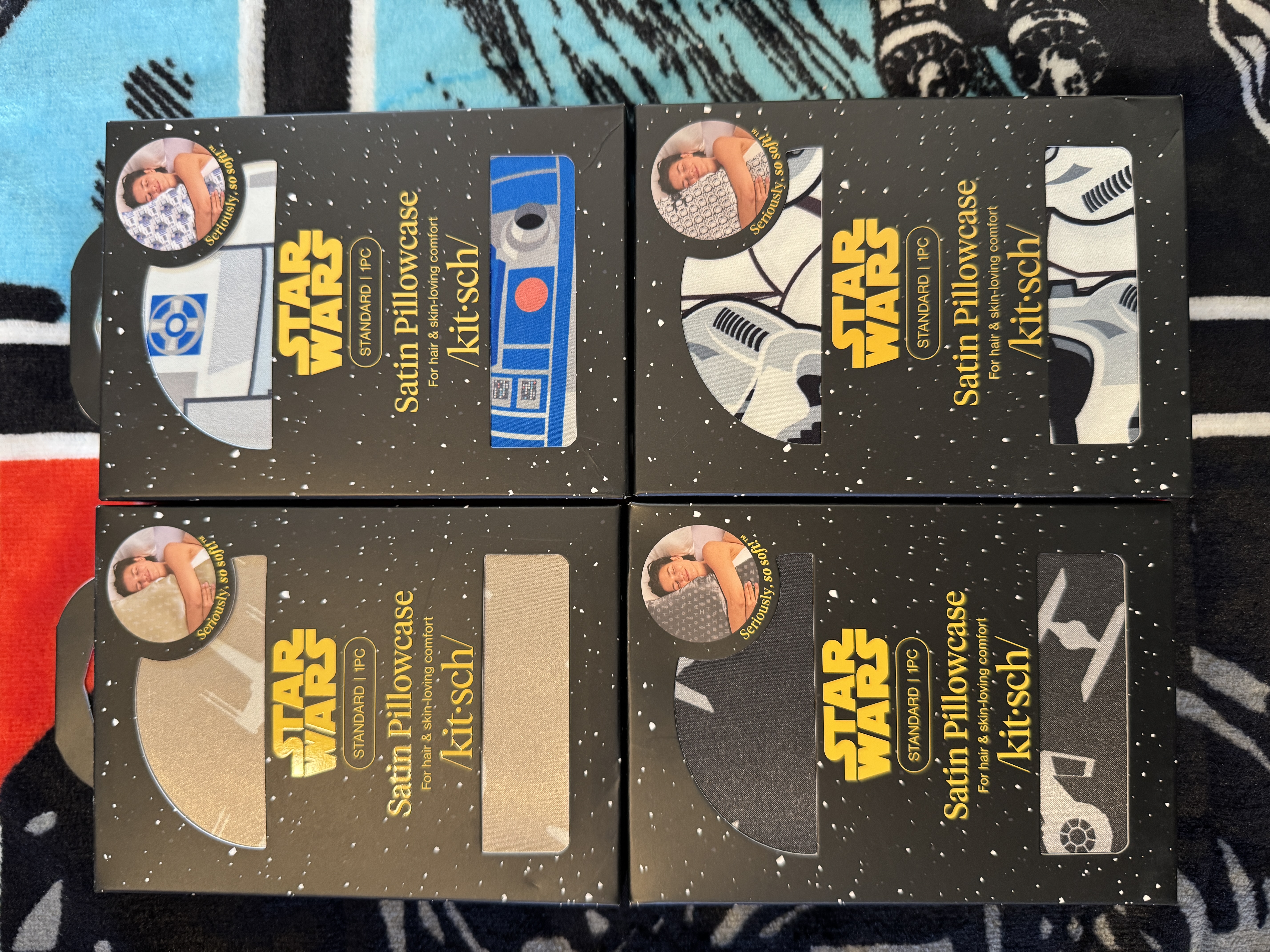Star Wars Accessories from Kitsch: Rebel Alliance Satin Pillowcase ($22.00), R2-D2 & C-3PO Satin Pillowcase ($22), Galactic Empire Satin Pillowcase ($28.00), Darth Vader & Stormtroopers Satin Pillowcase ($28.00), Light Side vs. Dark Side Satin Flexi Rods ($18.00), R2-D2 & Stormtrooper Pillow Scrunchies In Satin ($19.99), C-3PO Glitter Cloud Clip ($12.00), R2-D2 Glitter Cloud Clip ($12.00), Darth Vader Glitter Cloud Clip ($12.00), Stormtrooper Glitter Cloud Clip ($12.00) - Wow! Kitsch makes a lot of really nice Star Wars home goods and hair supplies. My wife was thrilled when I brought these home.