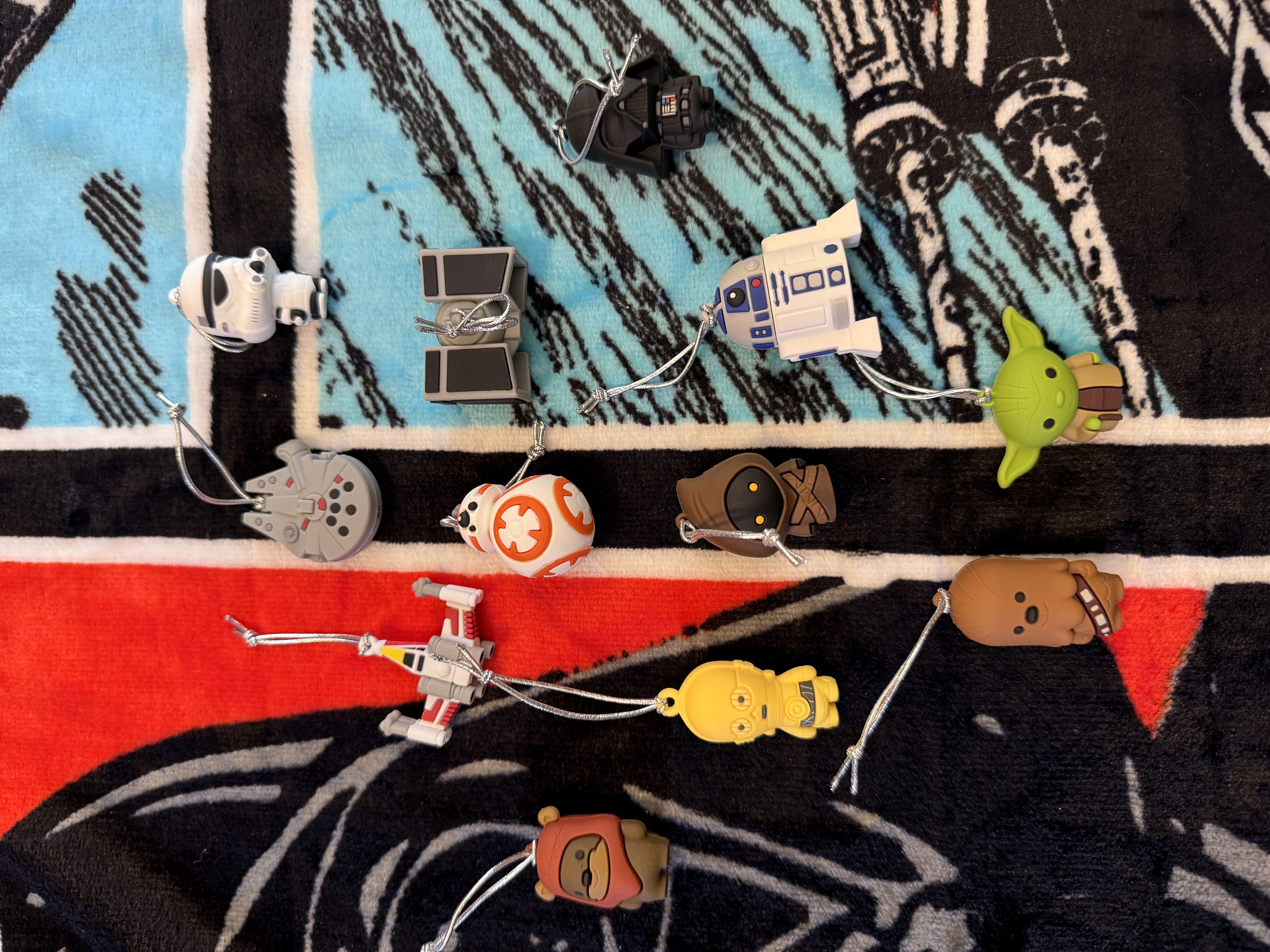Star Wars Countdown Calendar Miniature Christmas Tree Set With 12 Mini Ornaments from Hallmark ($29.99) - I'll confess that I wasn't sure the tree itself would survive the trip home, but I did save the ornaments, and it's a nifty little set with some fun characters and ships, including the Millennium Falcon, an Imperial Stormtrooper, an X-wing starfighter, Darth Vader's TIE Advanced, Wicket W. Warrick, BB-8, C-3PO, a Jawa, R2-D2, Darth Vader, Chewbacca, and Yoda.
