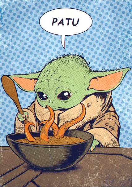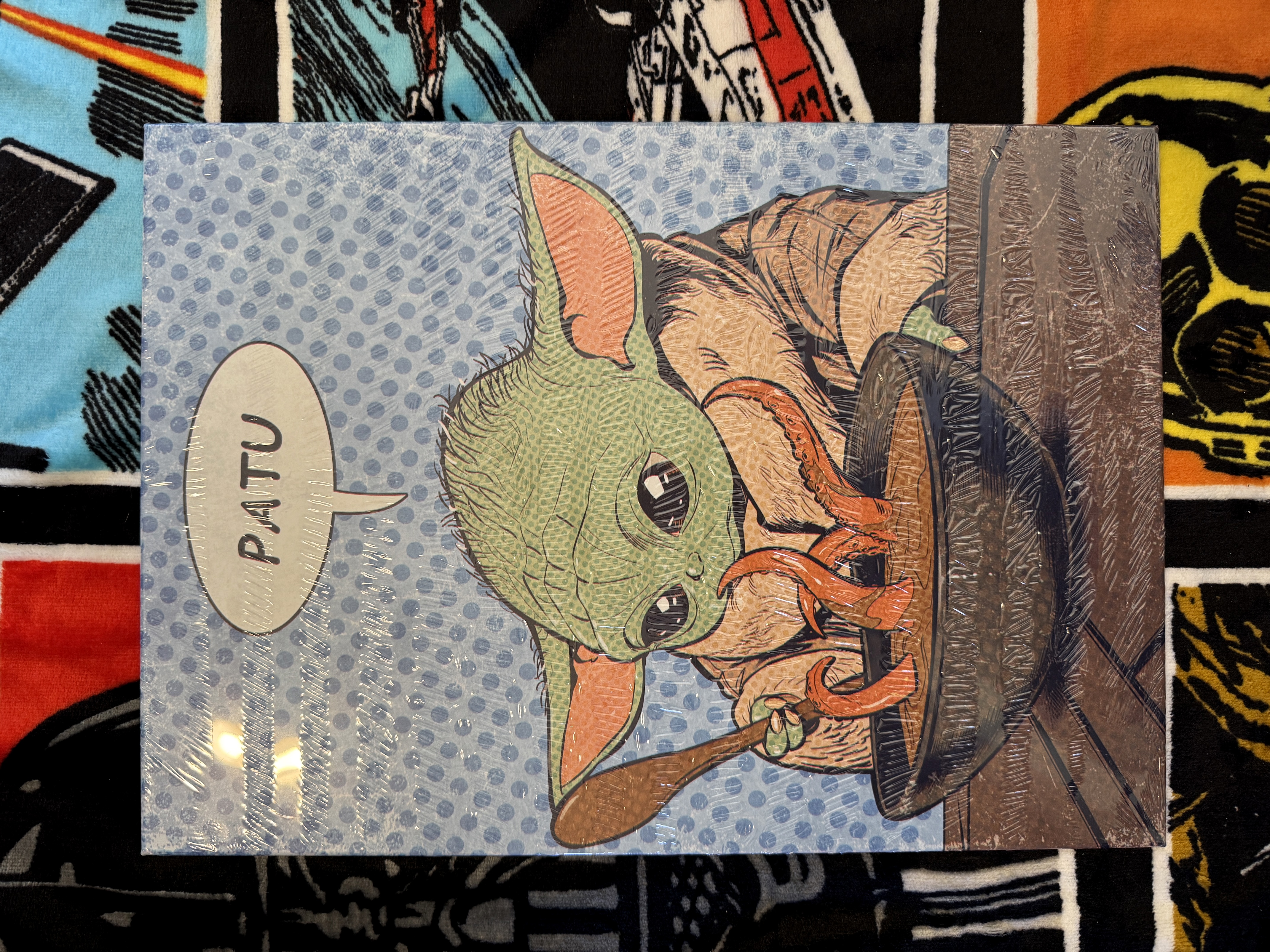 Patu! Grogu Eating Trask Chowder from Displate ($49.99) - My favorite previously unacknowledged Grogu noise gets highlighted here as our favorite "Baby Yoda" chows down on a squid-like meal. I gotta find wall space for this one.