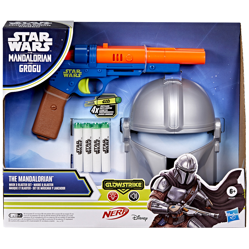 • Secondly we've got Hasbro's Star Wars The Mandalorian and Grogu Mask & Blaster Set ($24.99), which is recommended for kids ages 6 and up. This role-play set includes a child-sized face mask version of Din Djarin's iconic helmet with an open visor, and a blue-and-orange blaster that utilizes NERF's GlowStrike technology with light effects, charging the darts to make them glow when fired. The blaster holds two darts and features a priming slide and a trigger that will fire one dart at a time. Four total Nerf GlowStrike foam darts are included, and the blaster requires one AA battery, which is not. Hasbro recommends this set for both indoor and outdoor play.