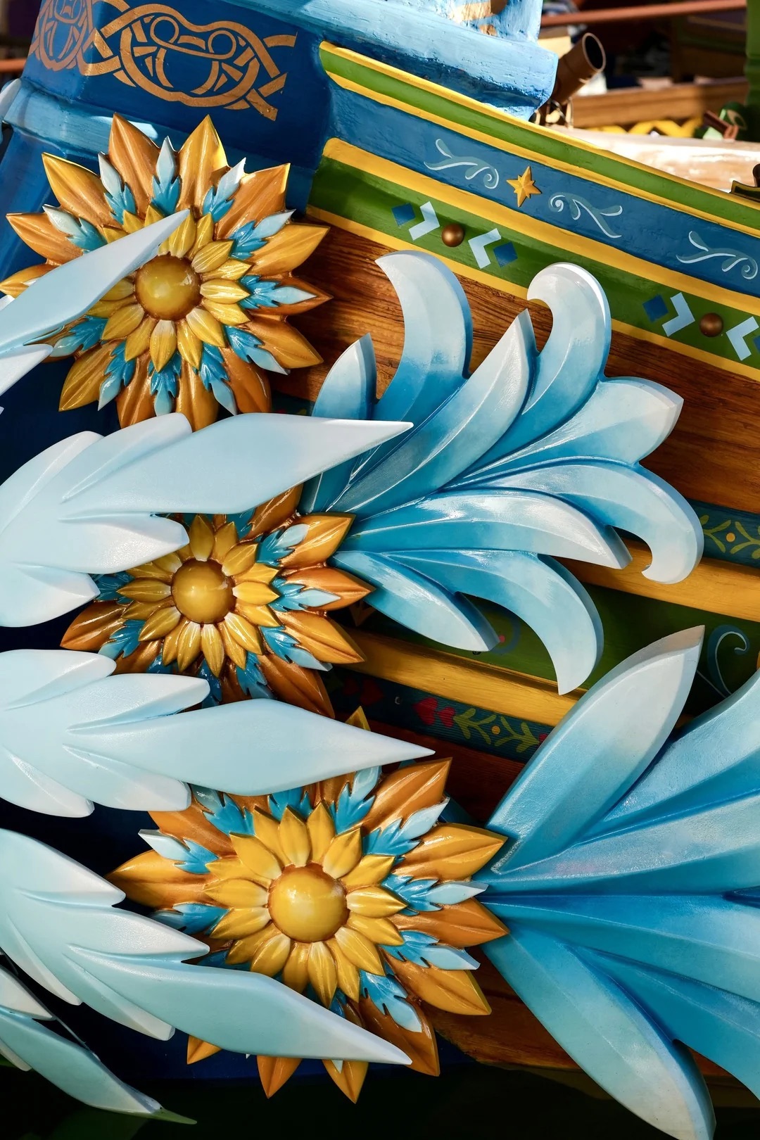 - Each boat has its own silhouette and aesthetic themed around different Frozen characters – for example, Kristoff’s boat features Arendelle’s official colors and emblem: the crocus, a symbol of renewal. Its most striking feature, though, is the bow, whose shape evokes an iconic figure of Arendelle.