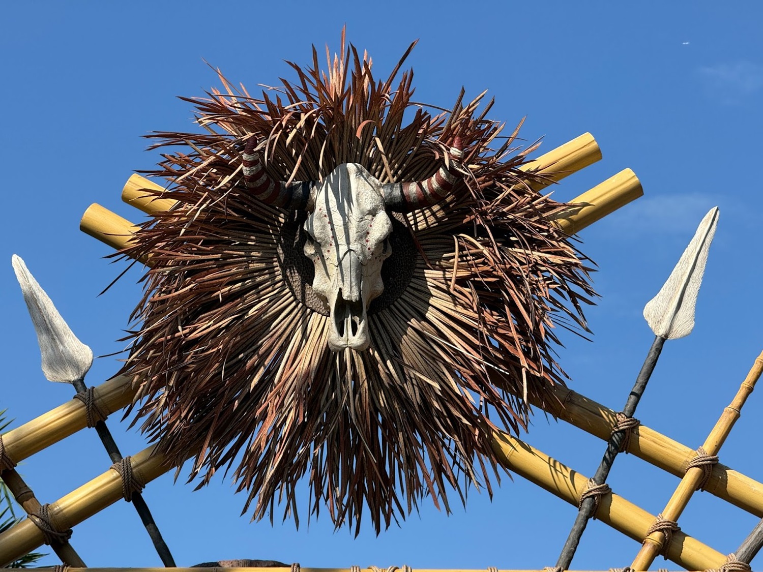 - Now, the sign is back, seeing no major changes, aside from a general refreshment. Guests can still see the tribal headwear and skulls as they cross into the land of adventure.