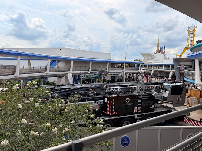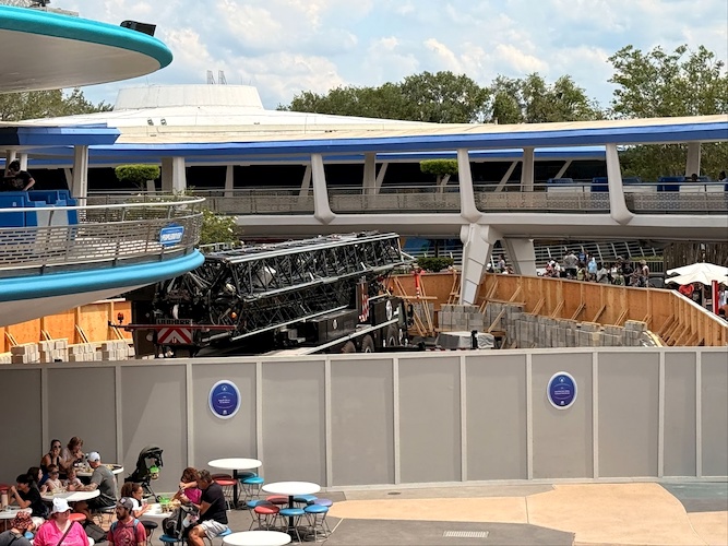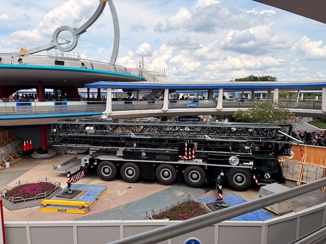 Work on Astro Orbiter continues at Magic Kingdom, as the large crane used to disassemble the attraction returns.