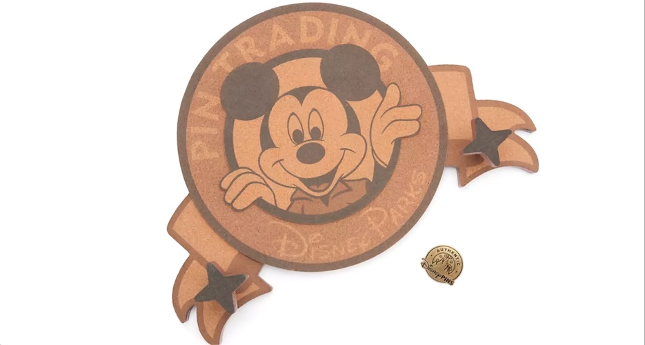 A new Mickey Mouse pin board is available at the Disney Store, which includes a Limited Release pin. The Mickey Mouse-adorned display comes with cork board backer and two lanyard hooks, plus a limited release ''Authentic Disney Pins'' brass finish badge.