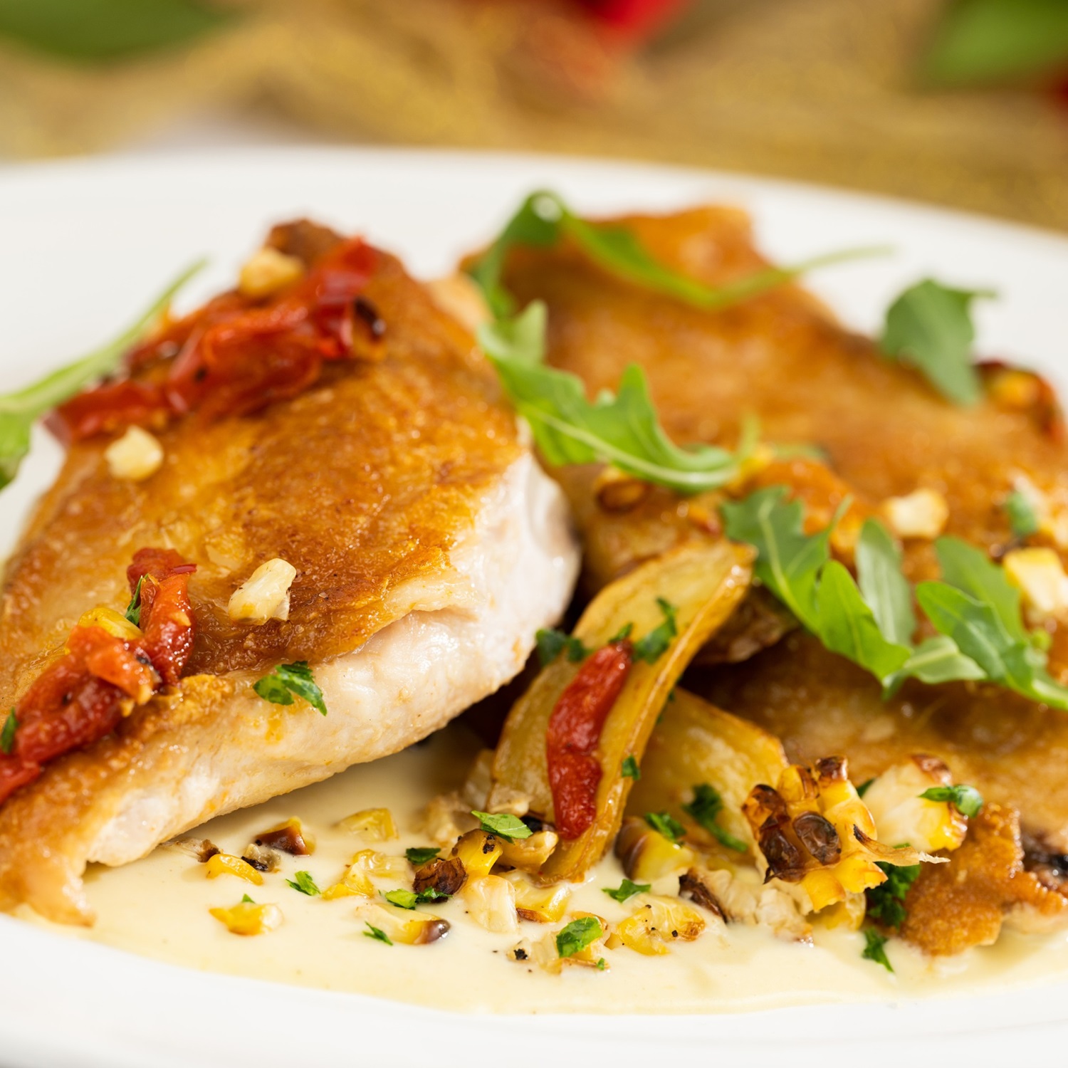 - New Description: Roasted potatoes, stewed pepper pipérade, and sweet corn velouté
