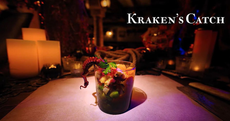 Kraken’s Catch features an octopus's tentacle marinated in lemon and lime juice with olives, bell peppers, avocados, and piquillo pepper almond foam.