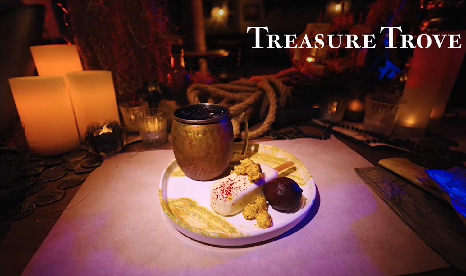 The Treasure Trove is a blend of ube, lemon, and coconut served with a vanilla cake “plank", chocolate “cannonball", and golden caramel popcorn.