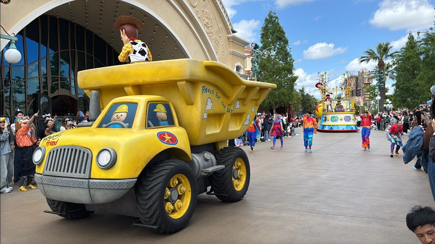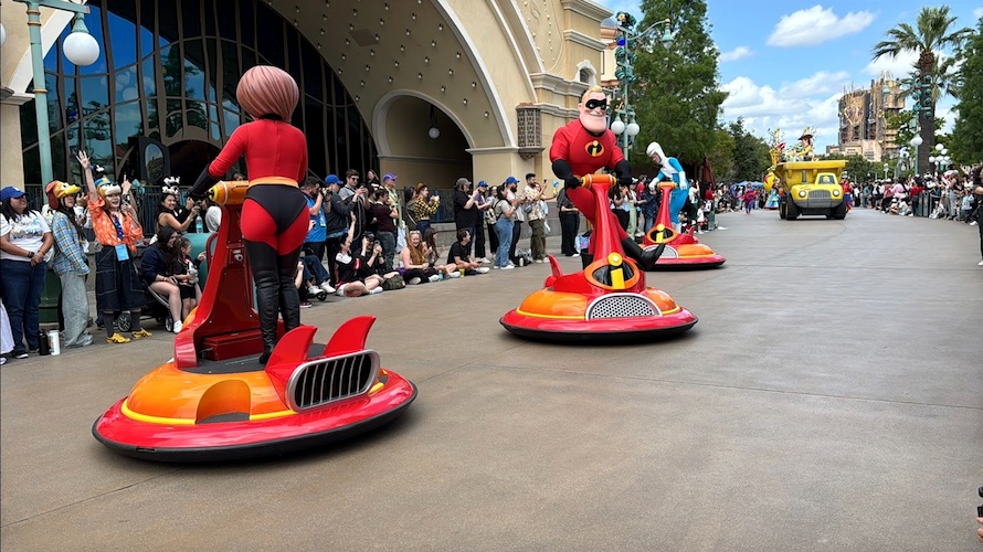 - Now rolling in for the grand finale, Mr. Incredible, Mrs. Incredible, and Frozone arrive aboard hovercrafts, Woody sits atop a toy dump truck, and a final Pixar ball inspired float decorated with fan-favorite characters closes out the show. Many elements of the finale are reused from the Pixar Play Parade.